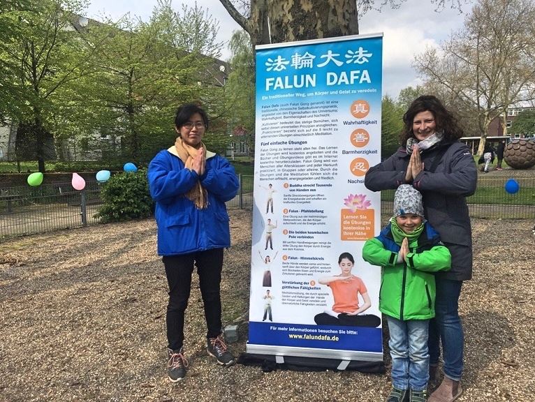 四月份是德国春暖花开的季节,这天又是周日,所以公园不时有游客。许多民众通过学员知道了法轮功,不断有民众在现场跟学员学炼五套功法,并且了解到迫害真相。一些民众还表示,要跟学员保持联系,深入了解法轮功。