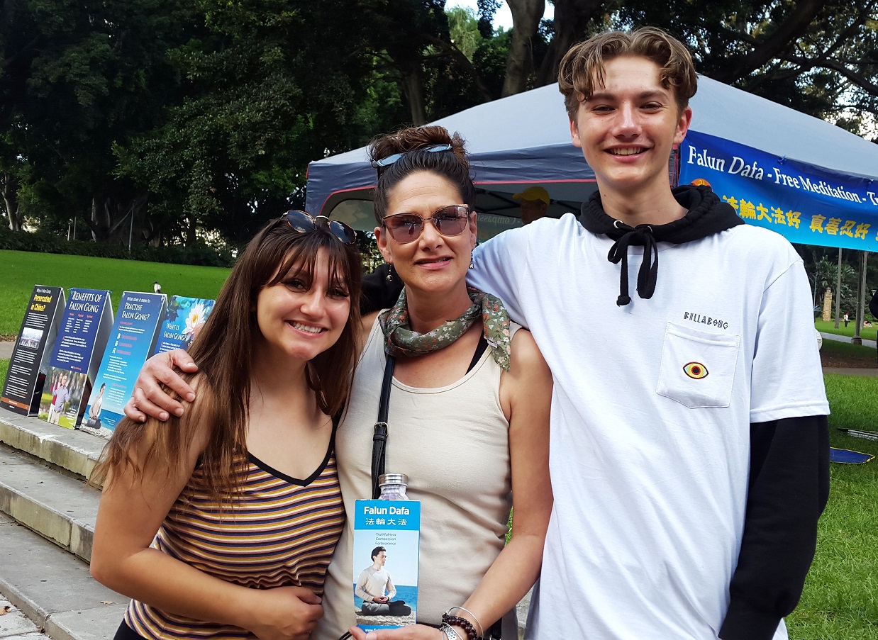 从美国来悉尼旅游的威尔斯(Kim Wells) 女士被法轮功学员打坐的祥和能量场吸引,她和两个孩子一起驻足观看。当她了解了法轮大法的美好以后表示:“今天是复活节,全世界人民都在庆祝这个日子,我很高兴看到法轮功学员在这里这么自信,和具备善的能量和愿望与世界民众分享他们已经受益的事情。看到法轮功学员在自身修炼真、善、忍中不断成熟,他们不但把自身修炼得更平静祥和,也把这些和平美好带给世人。我很欣赏。”