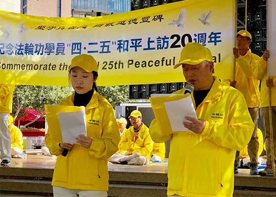 4月21日,北台湾地区1200名法轮功学员,在台北市政府前的市民广场举行记者会和集体炼功,纪念“四·二五”法轮功学员和平上访二十周年,揭露中共残酷迫害的恶行及其邪恶本质,呼吁制止中共迫害。