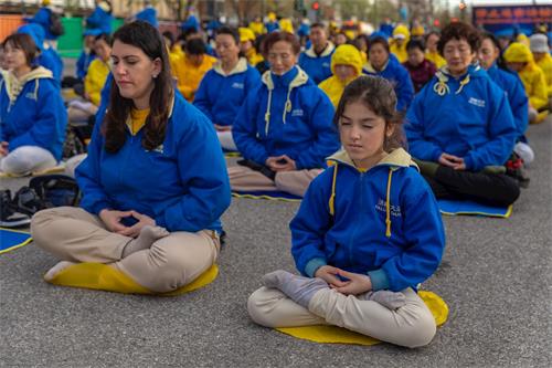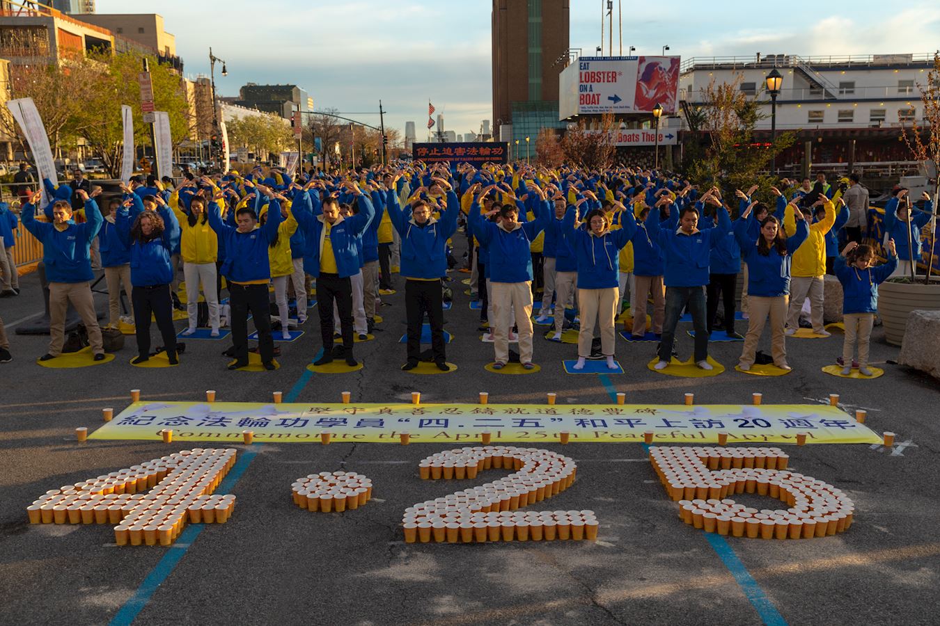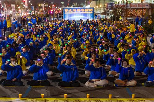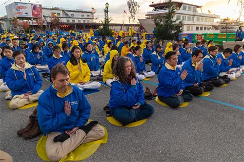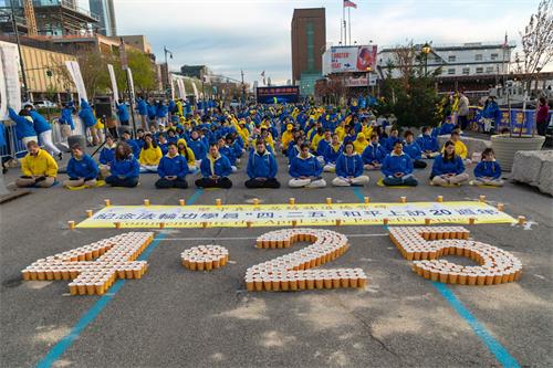 图1~5:二零一九年四月二十日傍晚,纽约部份法轮功学员在纽约中领馆前,举行烛光夜悼活动。当天下午六时许,法轮功学员开始集体炼功,场面庄严祥和。