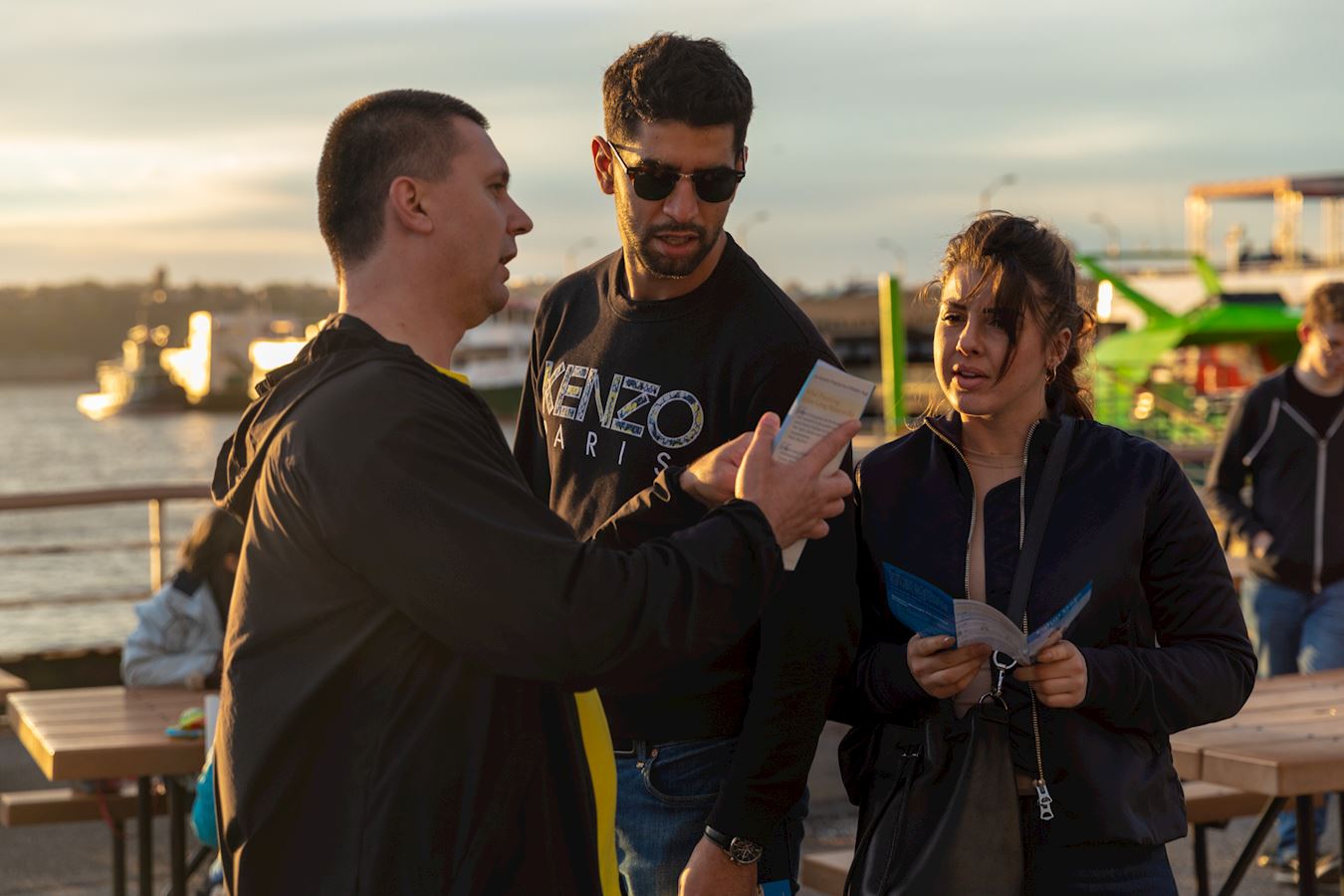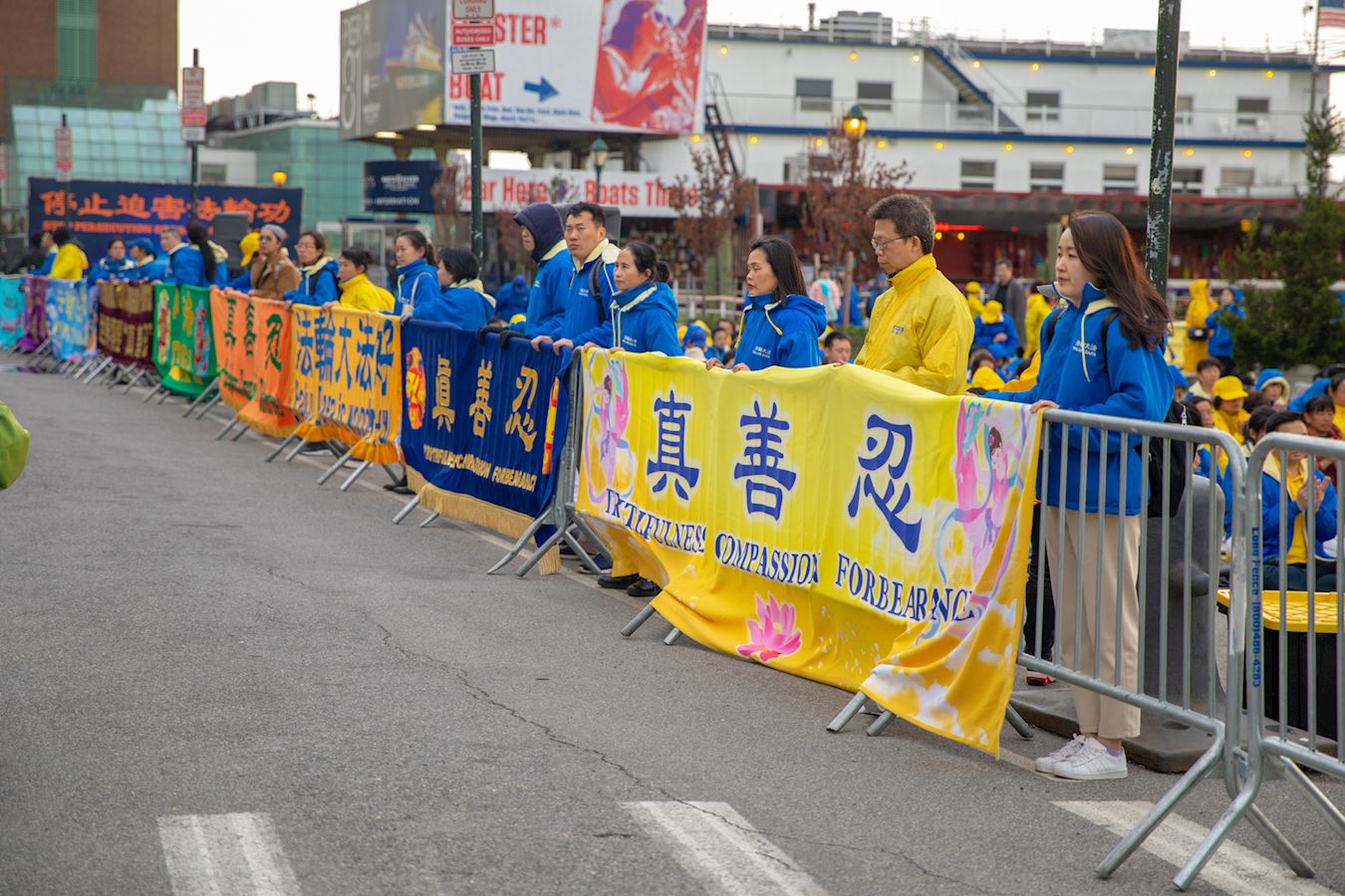 哈德逊河畔,不少民众被法轮功学员慈悲、感人的氛围所吸引。一位MTA的工作人员拿过法轮功的简介,并感动地说,“这些人的抗议场面如此平静与平和。”