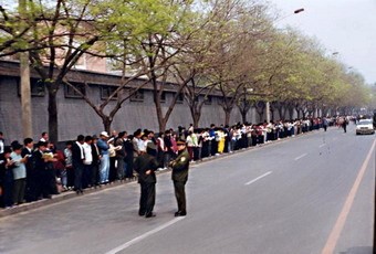 ![]() “四·二五”北京和平上访现场照片:静静的上访群众和悠闲的警察,看不出任何“围攻”的气氛 |
