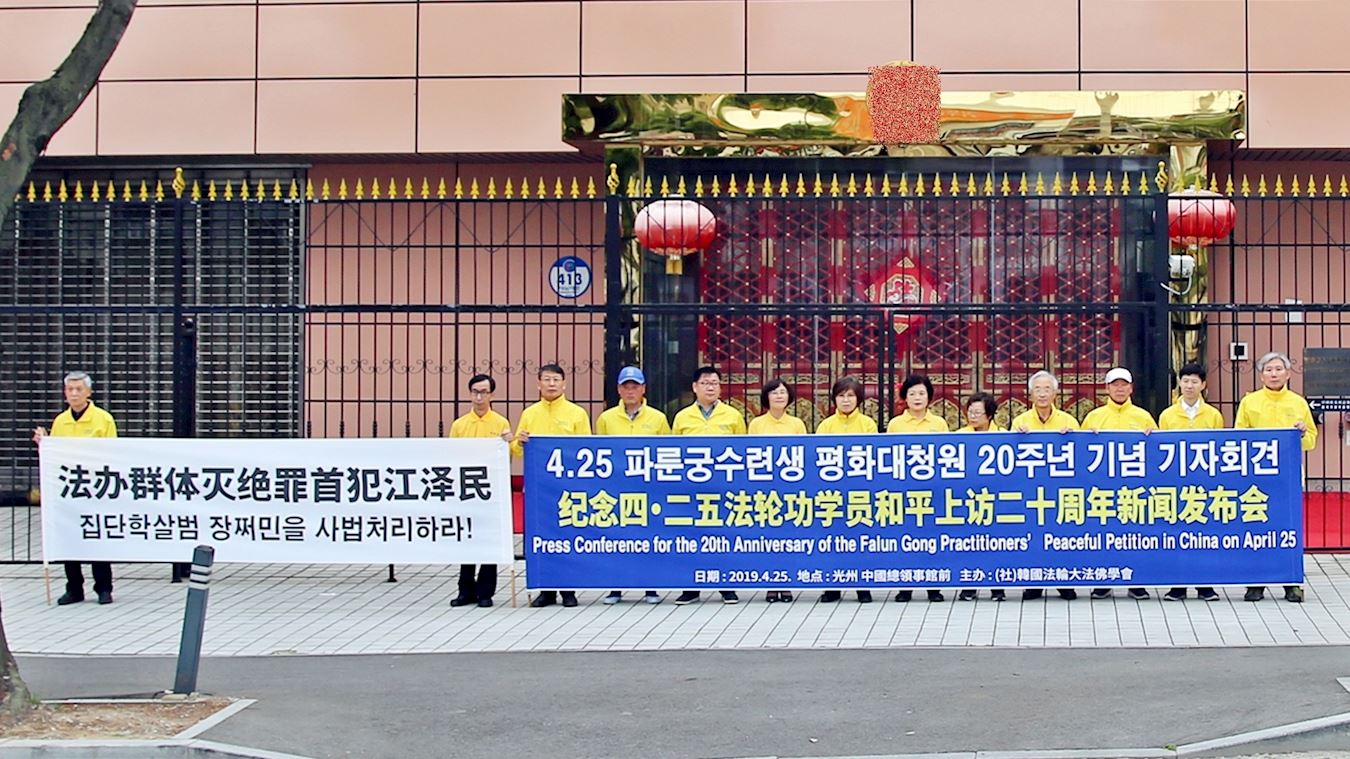 【明慧网二零一九年四月三十日】二零一九年四月二十五日,韩国法轮功学员们在首尔中使馆、釜山和光州中领馆前同时举行新闻发布会,以纪念二十年前的今天,万名法轮功学员“四·二五”北京和平上访、争取信仰自由的历史性事件,揭露并抗议中共的迫害,呼吁各界共同解体中共,制止迫害。