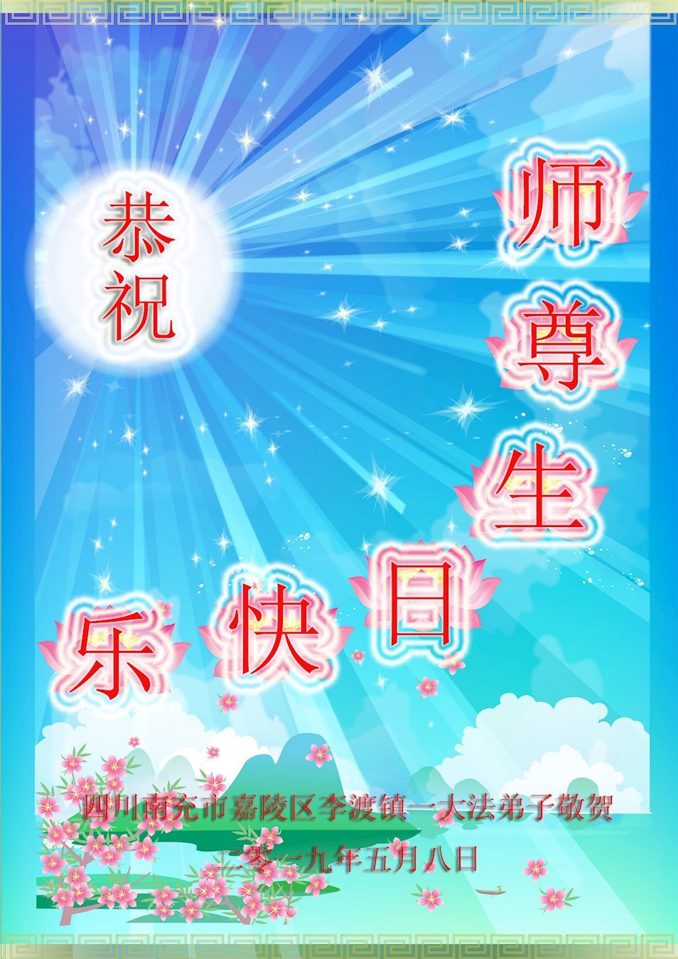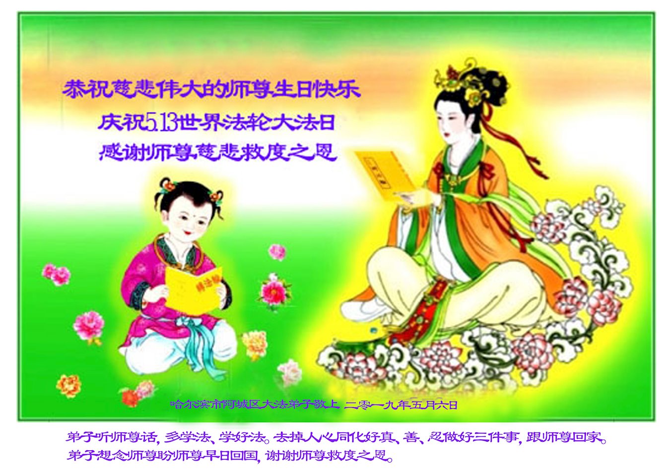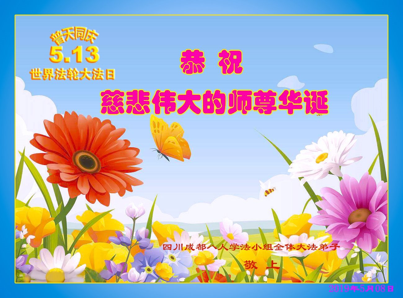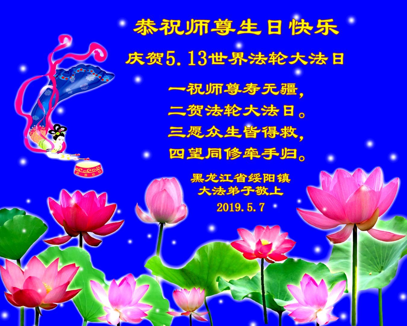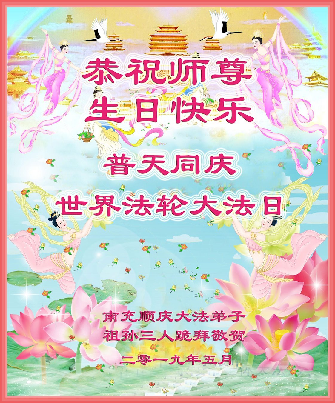 【明慧网二零一九年五月十二日】二十七年前的五月十三日,李洪志师父将法轮大法公开传世,“真、善、忍”的法理为全球五大洲不同族裔的上亿修炼者带来新生,也为他们的家庭和身处的社会带来祥和与美好。五月十三日也是师父的生日,每年此季,世界各地的法轮功学员都会举办庆典向师尊恭祝华诞。
