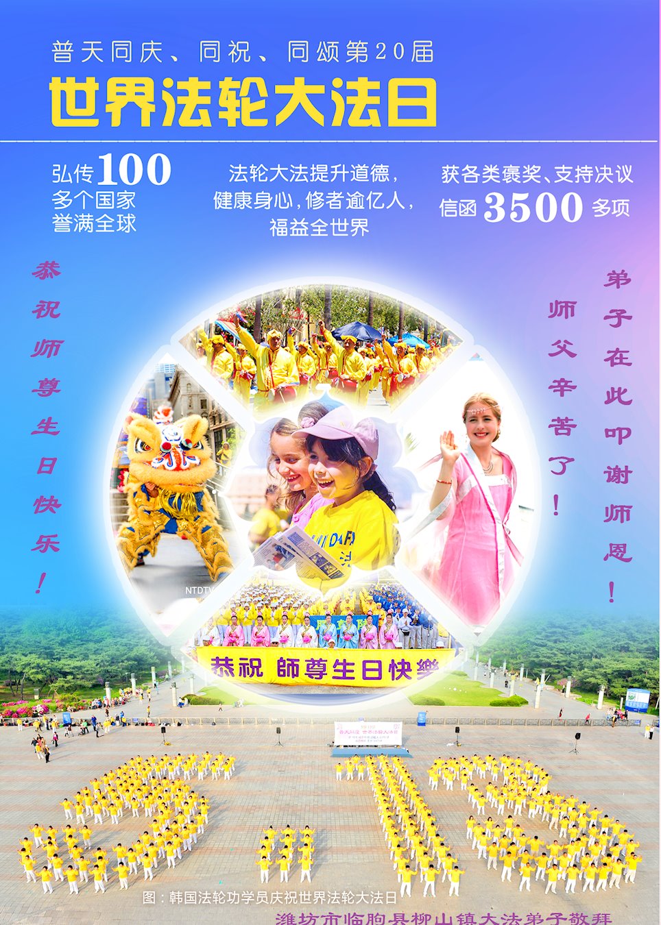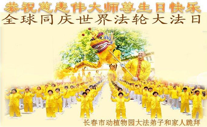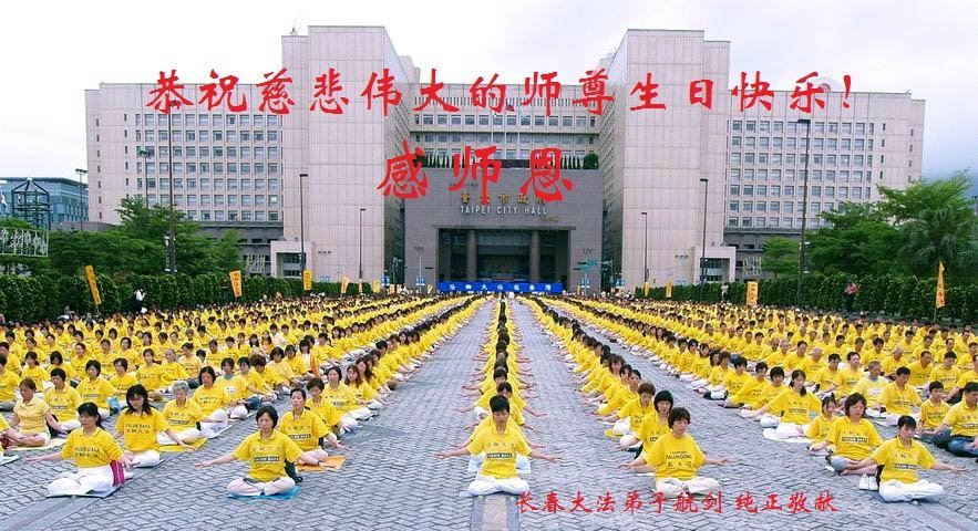 下午四点,庆典圆满结束之际,法轮功学员集体合影,齐颂“恭祝师父生日快乐!法轮大法好!真善忍好!”