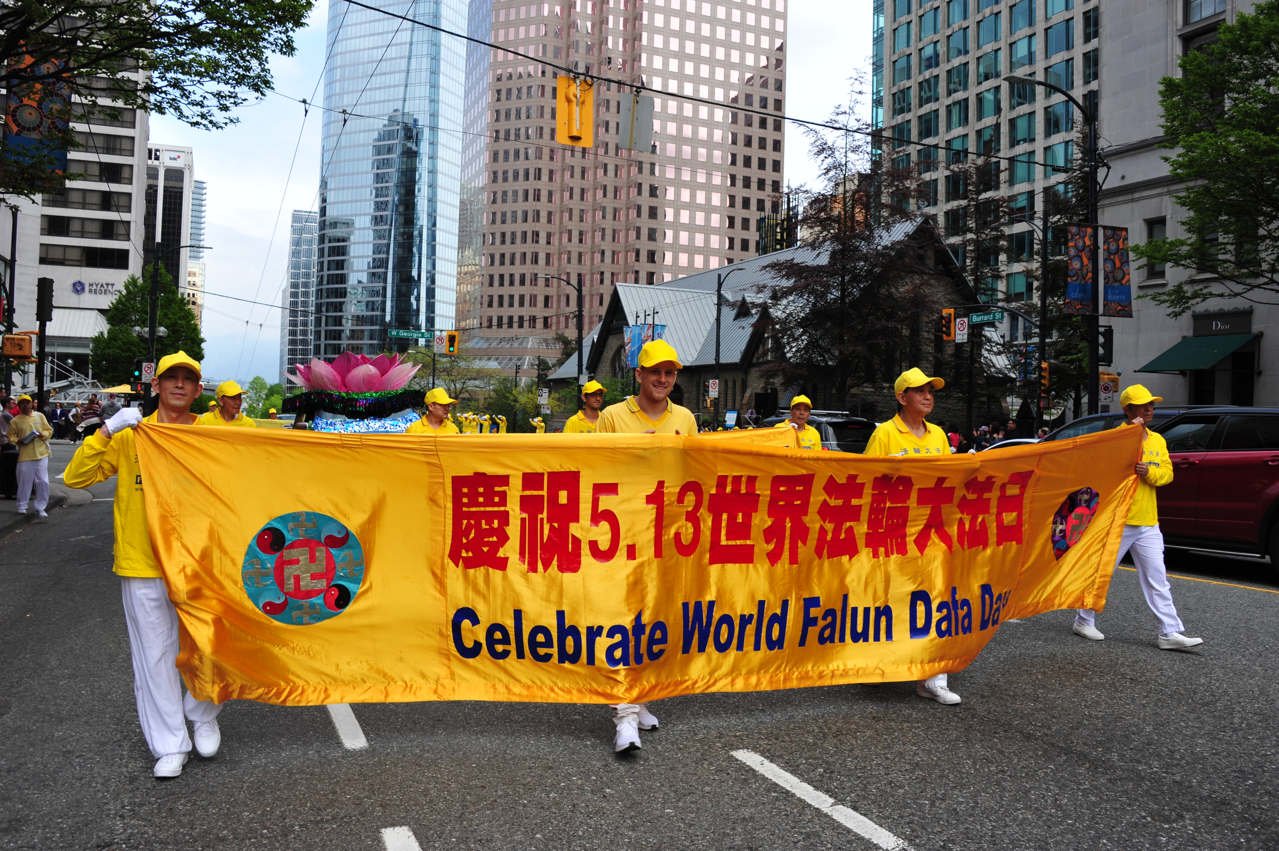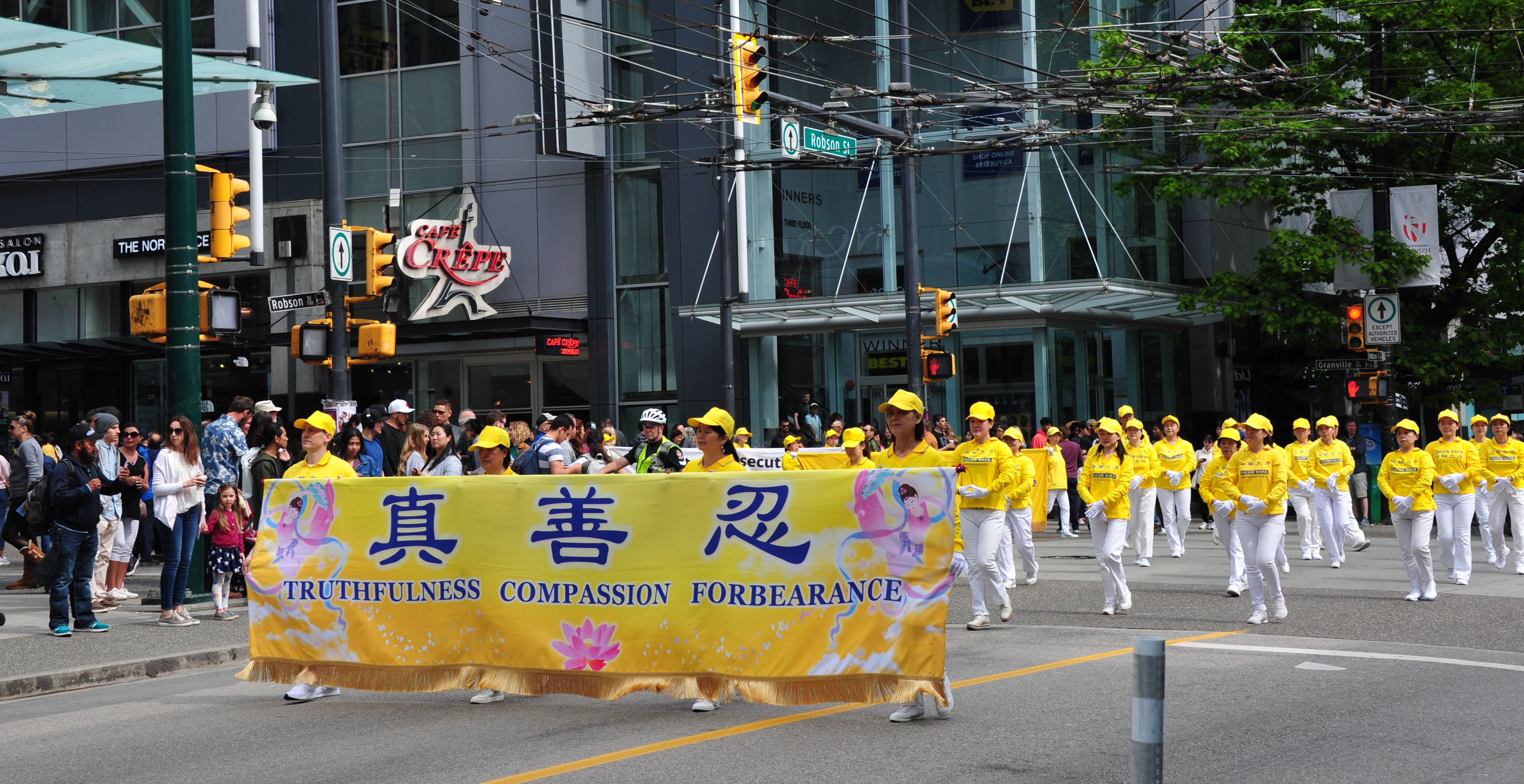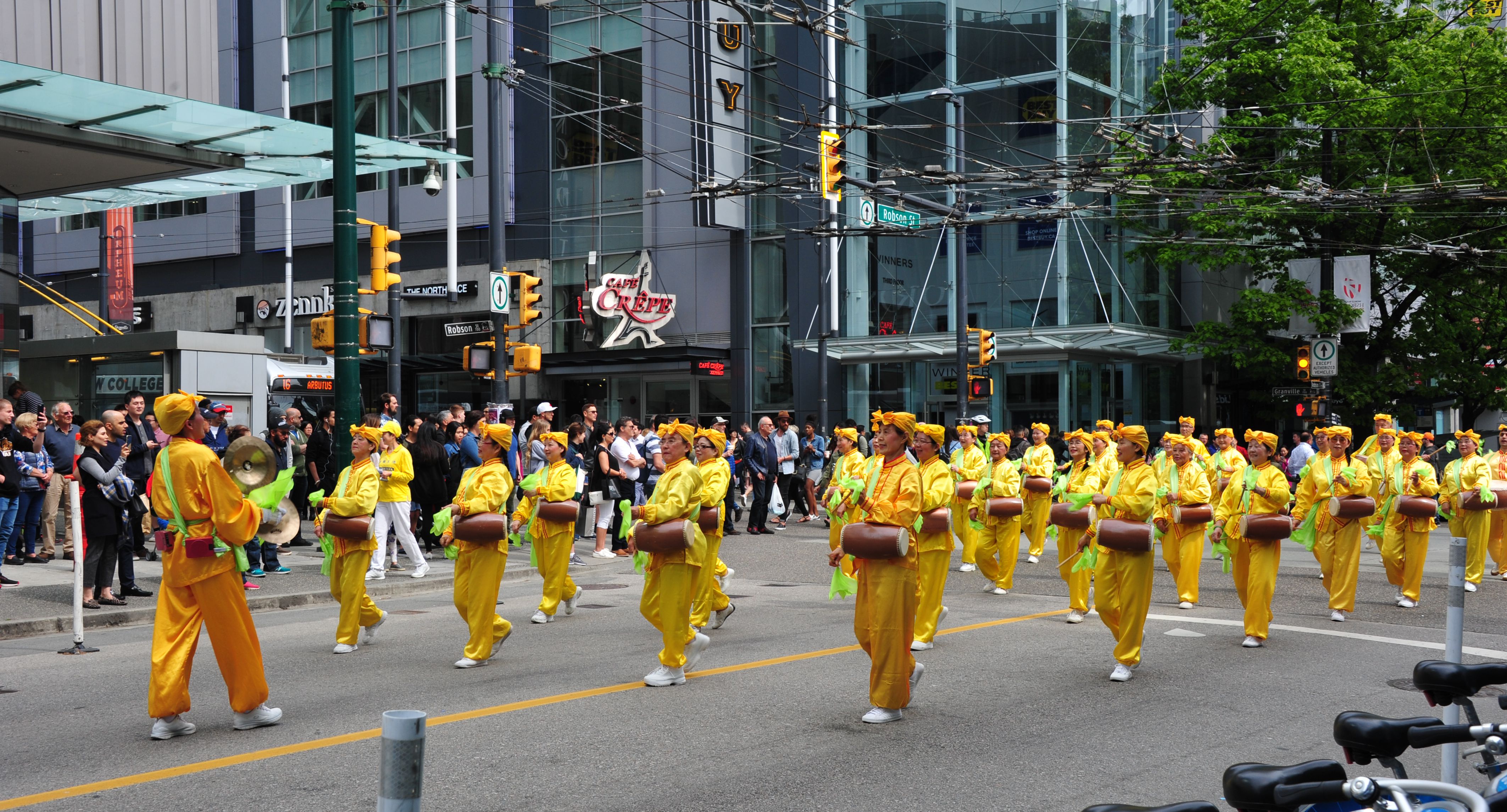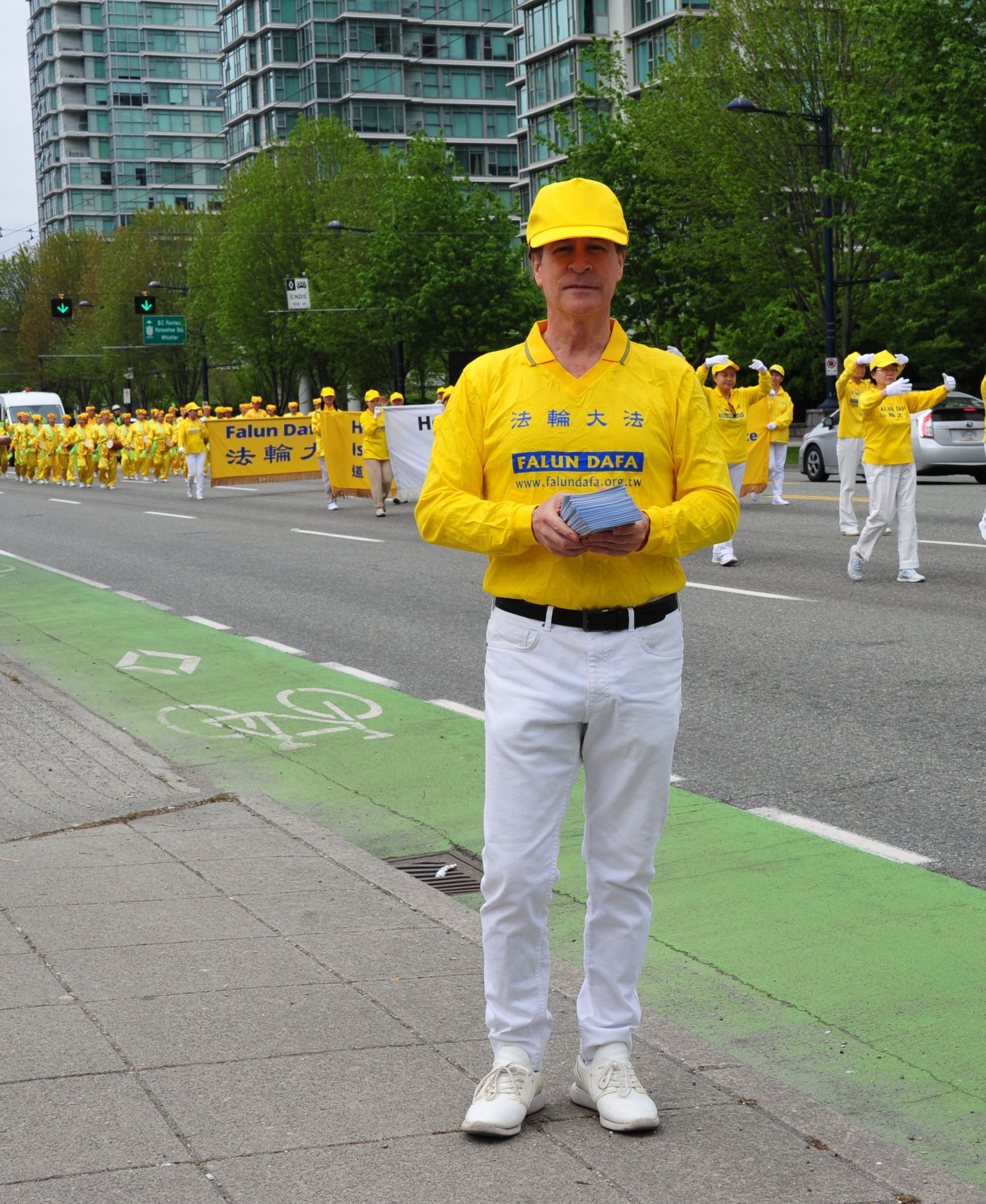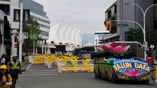 5月12日周日,温哥华气温凉爽,市中心有很多休闲的市民和游客。法轮功学员的游行队伍由天国乐团,横幅队,“真善忍”花车,法轮功功法演示队,腰鼓队等组成。大批民众拍摄游行场面,或与队伍合影,有行人向法轮功游行队伍挥手致意,或举出胜利的手势,还有人向游行队伍双手合十并弯腰致意。市民纷纷赞叹“太好了”,“真美呀”,“让我好好享受这一刻”。很多行人接受了法轮功资料后,立即询问在哪里可以学习功法。很多华人纷纷拍摄游行场面。也有西人电视台记者到现场拍摄。