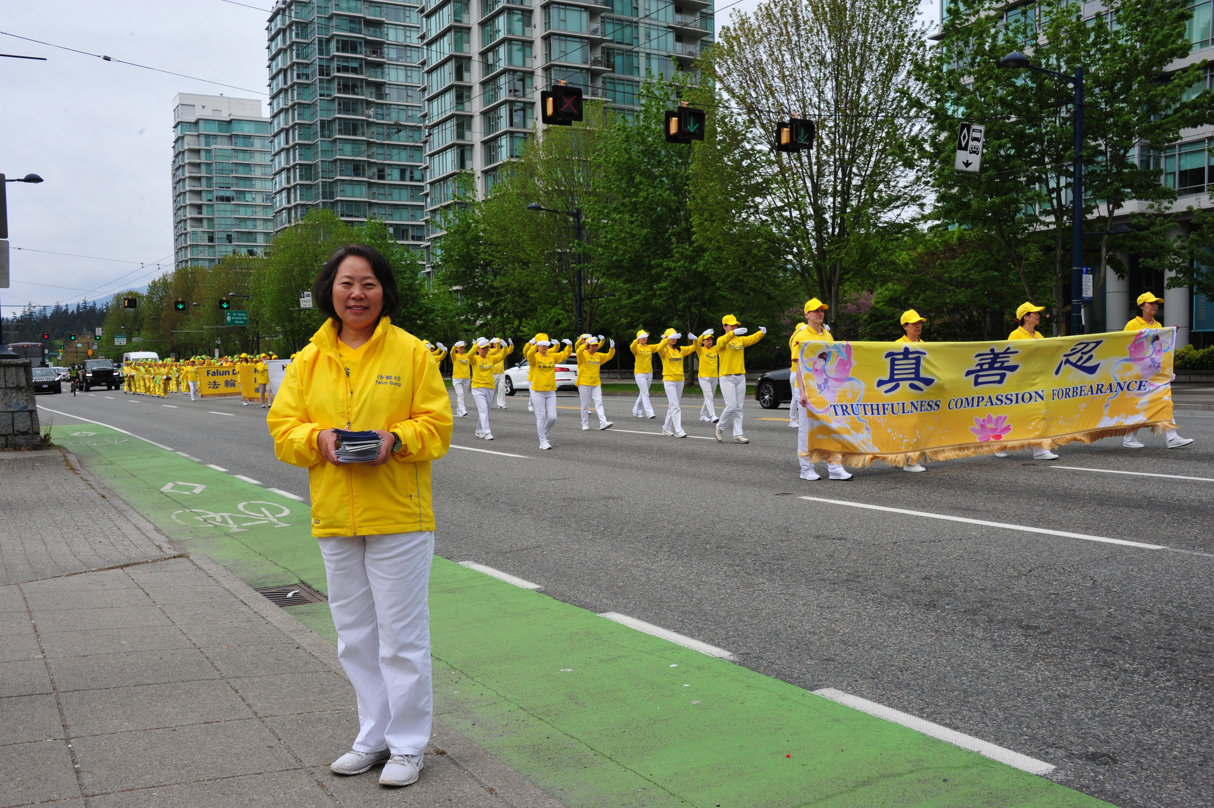 法轮功学员张女士特意从温哥华岛的维多利亚市坐船赶来温哥华参加法轮大法日的庆祝活动。她表示,她在修炼法轮功前,身体处于不太健康的状况,有诸如疲劳失眠等症状,身体经常不舒服,修炼法轮功后不到两个月,让她惊喜的是身体的不良状况一扫而光,而且最主要的是法轮大法回答了她许久所追寻的对宇宙和生命的困惑,她从此可以快乐的生活,生活中充满阳光。讲到这里张女士禁不住热泪盈眶。所以她特意前来参加活动,表达对师父的感恩。张女士说,这么好的功法却无端受到中共迫害,还有很多人被迫害谎言所迷惑,她觉得自己有责任告诉世人法轮功真相,呼吁世人一起努力制止迫害法轮功。