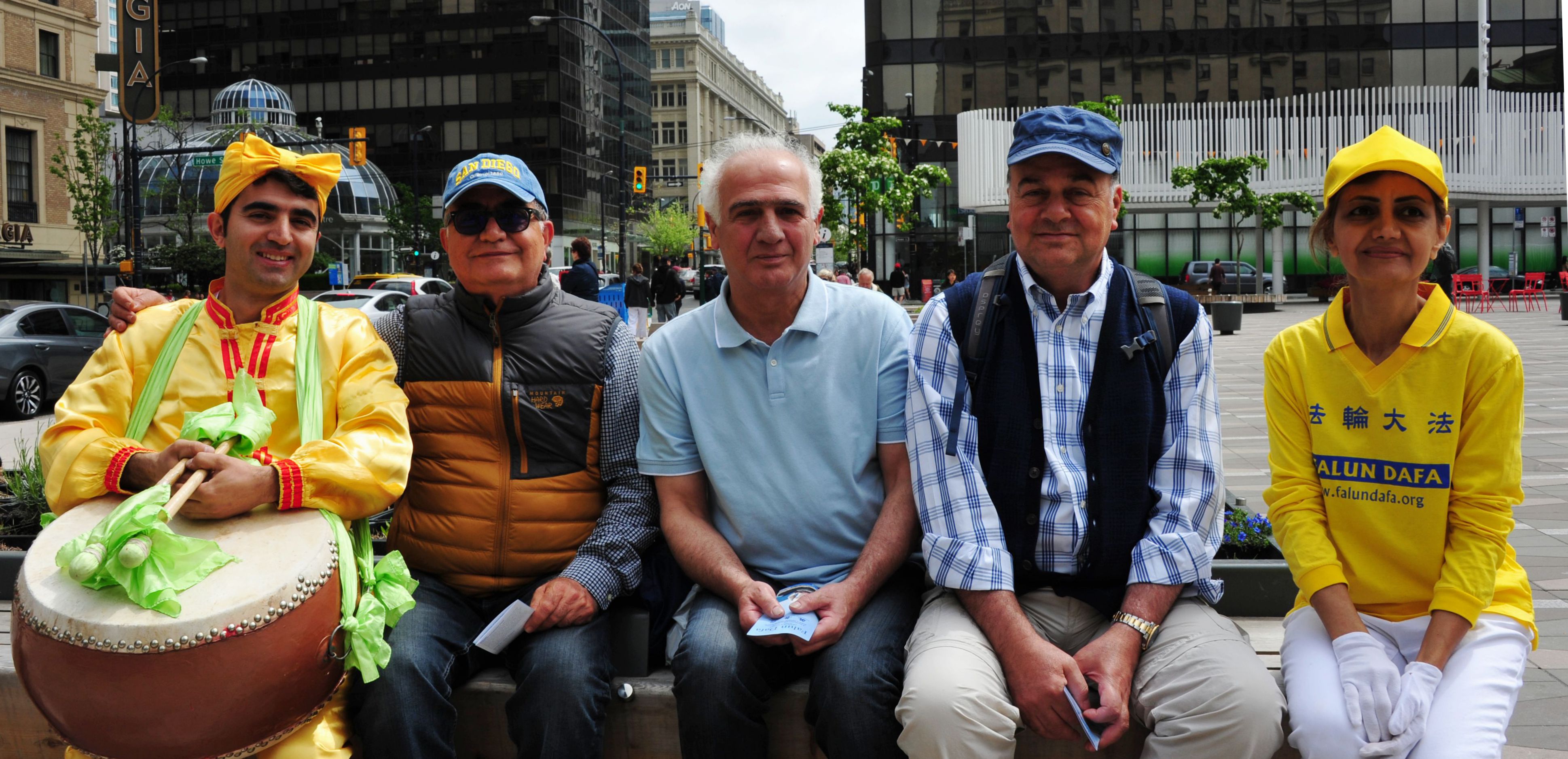 Syed Ghiyoomi先生是伊朗移民,他是位天然气工程师,曾经参加过很多世界各地的大型项目。他与朋友路过市中心,被法轮功学员祥和的音乐所吸引。他马上主动询问详细情况,并表示,法轮功学员的音乐非常祥和,很吸引人,整个活动现场充满祥和的能量,他可以感受到,所以不由自主地被吸引过来。他拿了法轮功真相资料,并长时间地停留在现场聆听现场的法轮功学员讲解,最后高兴地与法轮功学员合影留念。