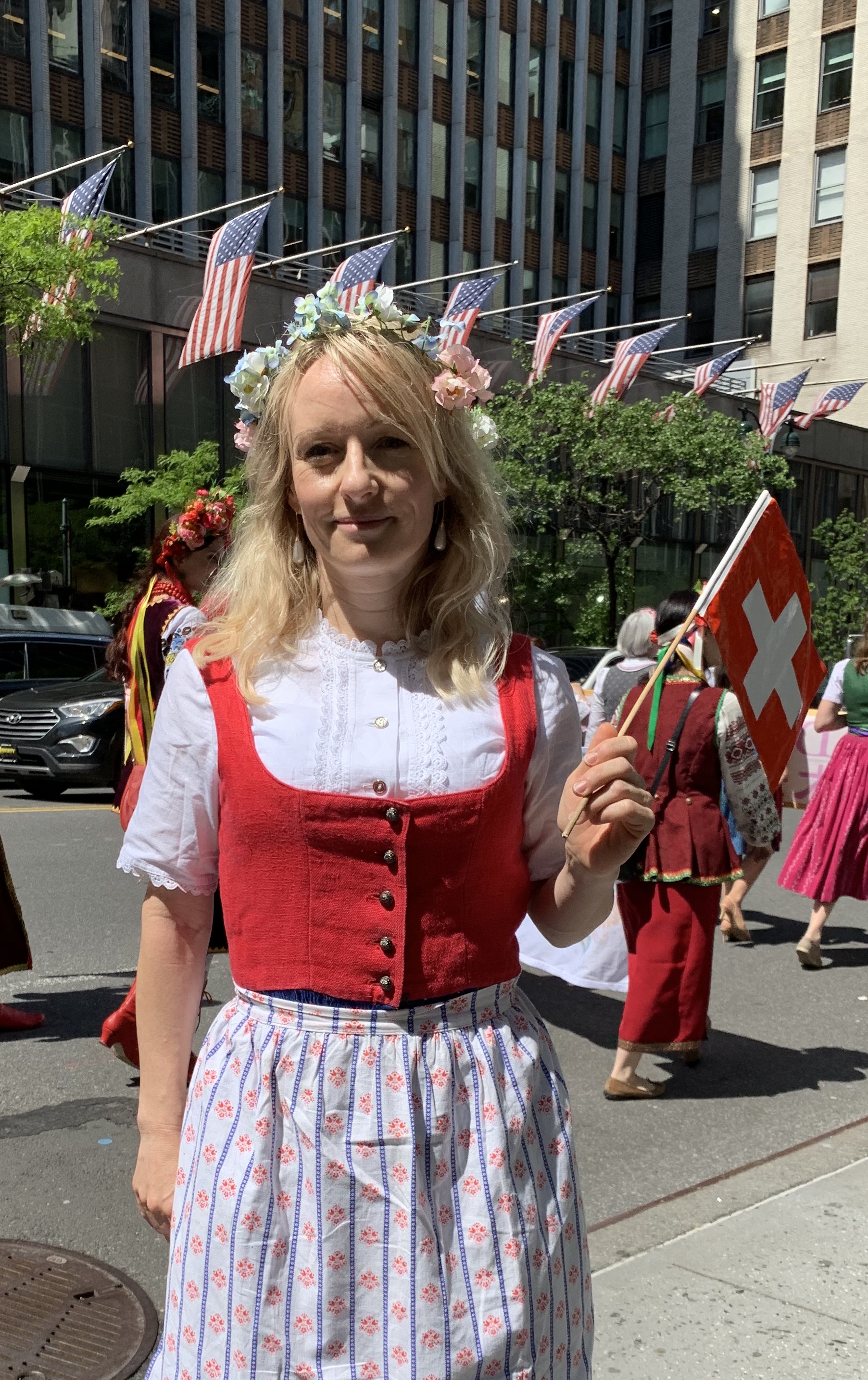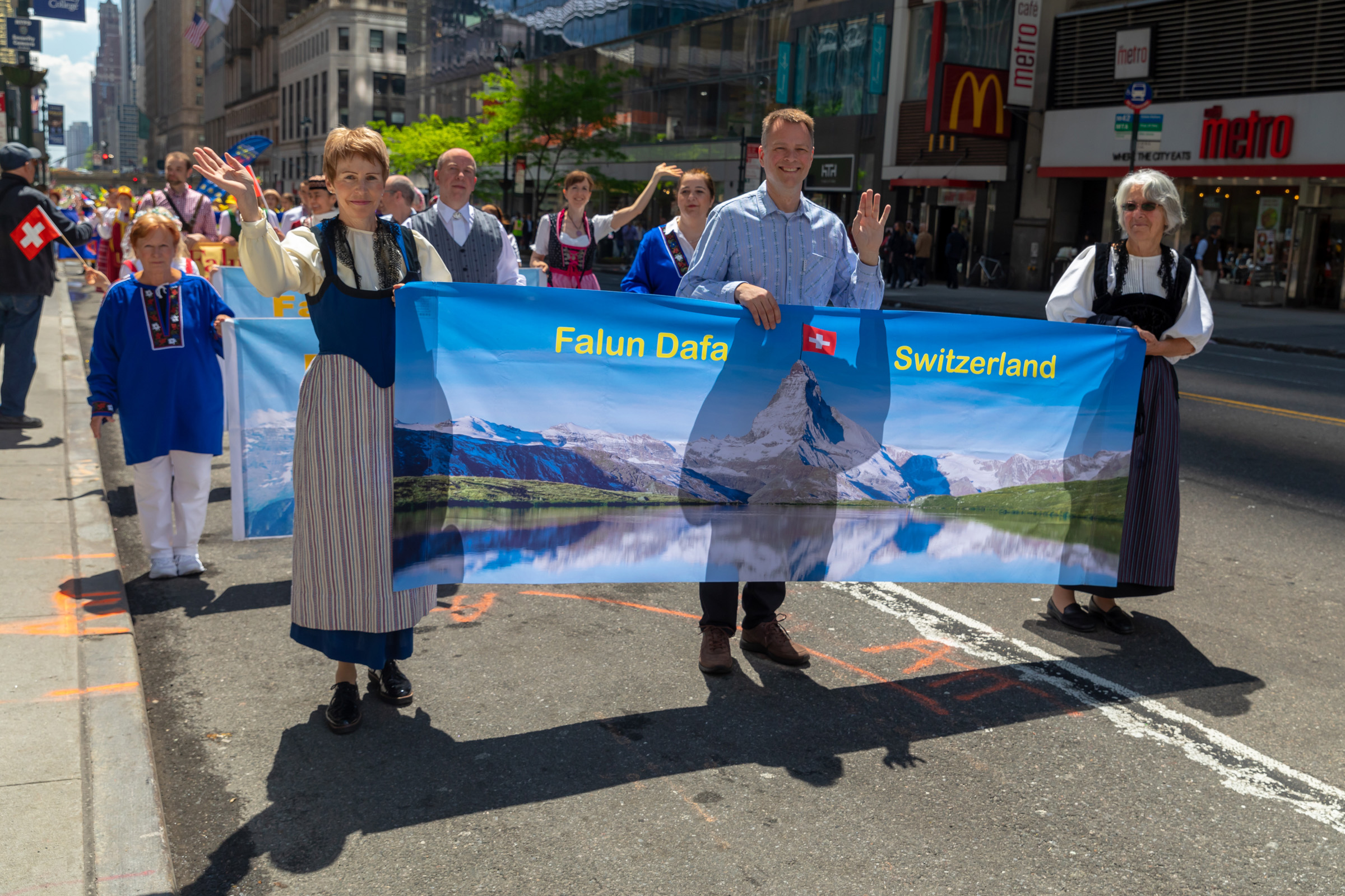 德妮丝·艾尔芙瑶登(Denise Alfjorden)是瑞士人,她今天穿着母亲亲手制作的传统服装来参加游行。修炼了九年的她回忆起得法的经历充满了幸福感。