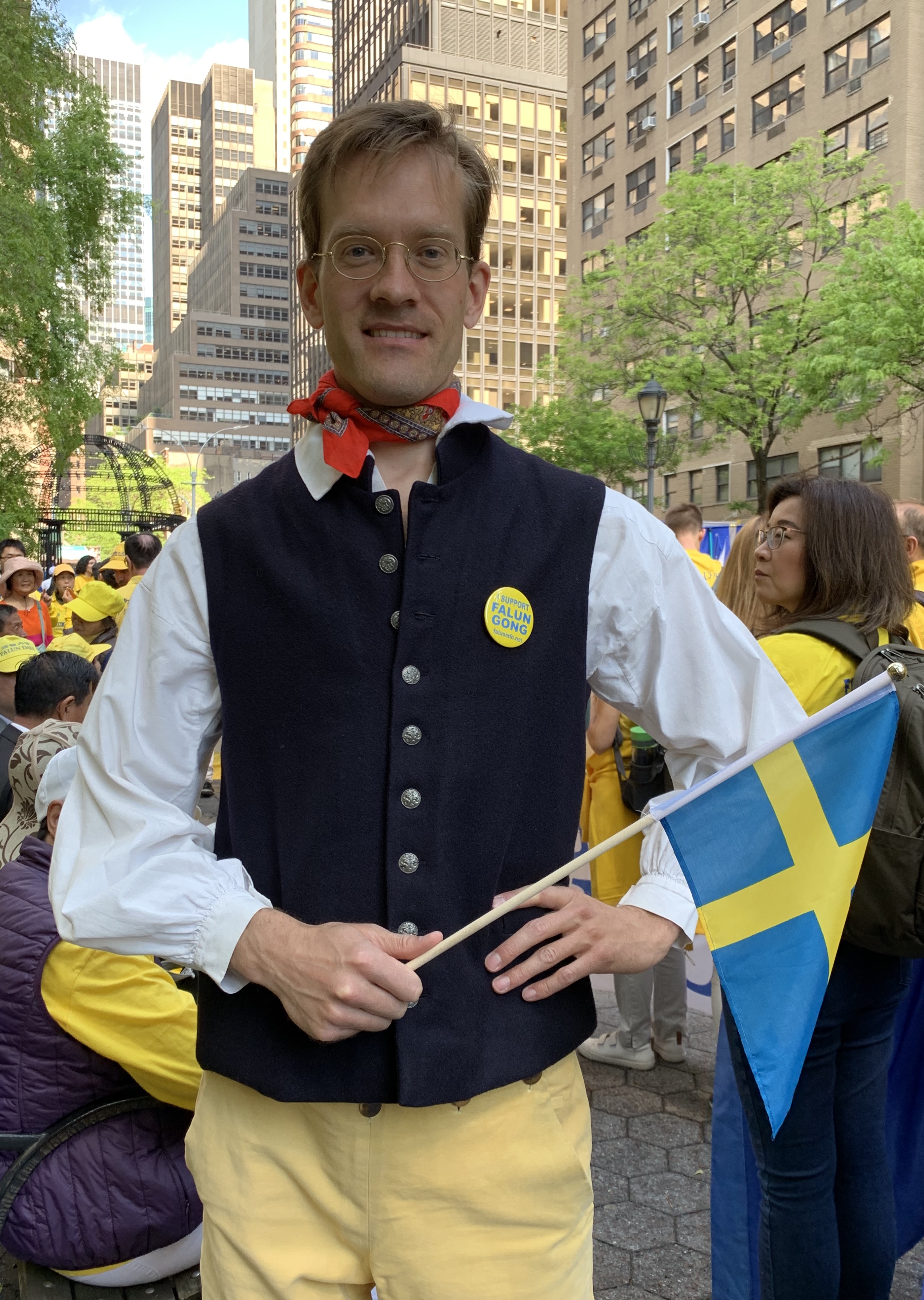 克里斯汀·尼尔森(Christian Nilsson)来自瑞典,是一位环保工程师。今天他穿上了瑞典的传统服饰、手举瑞典国旗参加了游行。修炼法轮大法前,他曾对社会很失望,因此还选择了环境保护专业准备拯救地球。但他在二零零零年开始修炼后感到,法轮大法能让人去掉不好的想法,让人充满希望。