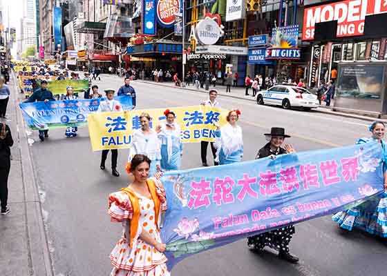 五月十六日,为庆祝世界法轮大法日,来自欧洲、亚洲、南美洲、北美洲、非洲、大洋洲六大洲的万名法轮功学员,聚集在纽约曼哈顿,举行盛大游行活动。