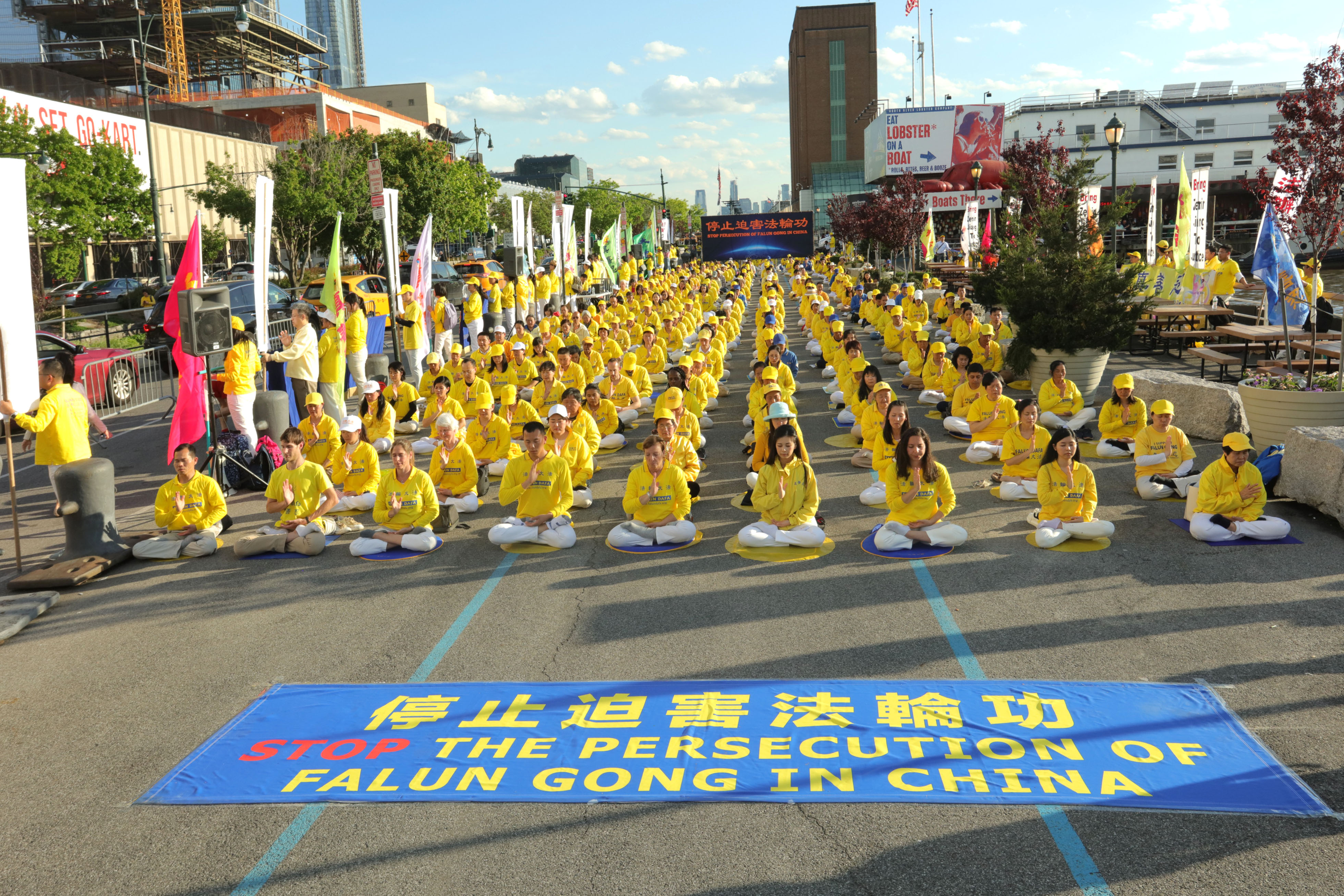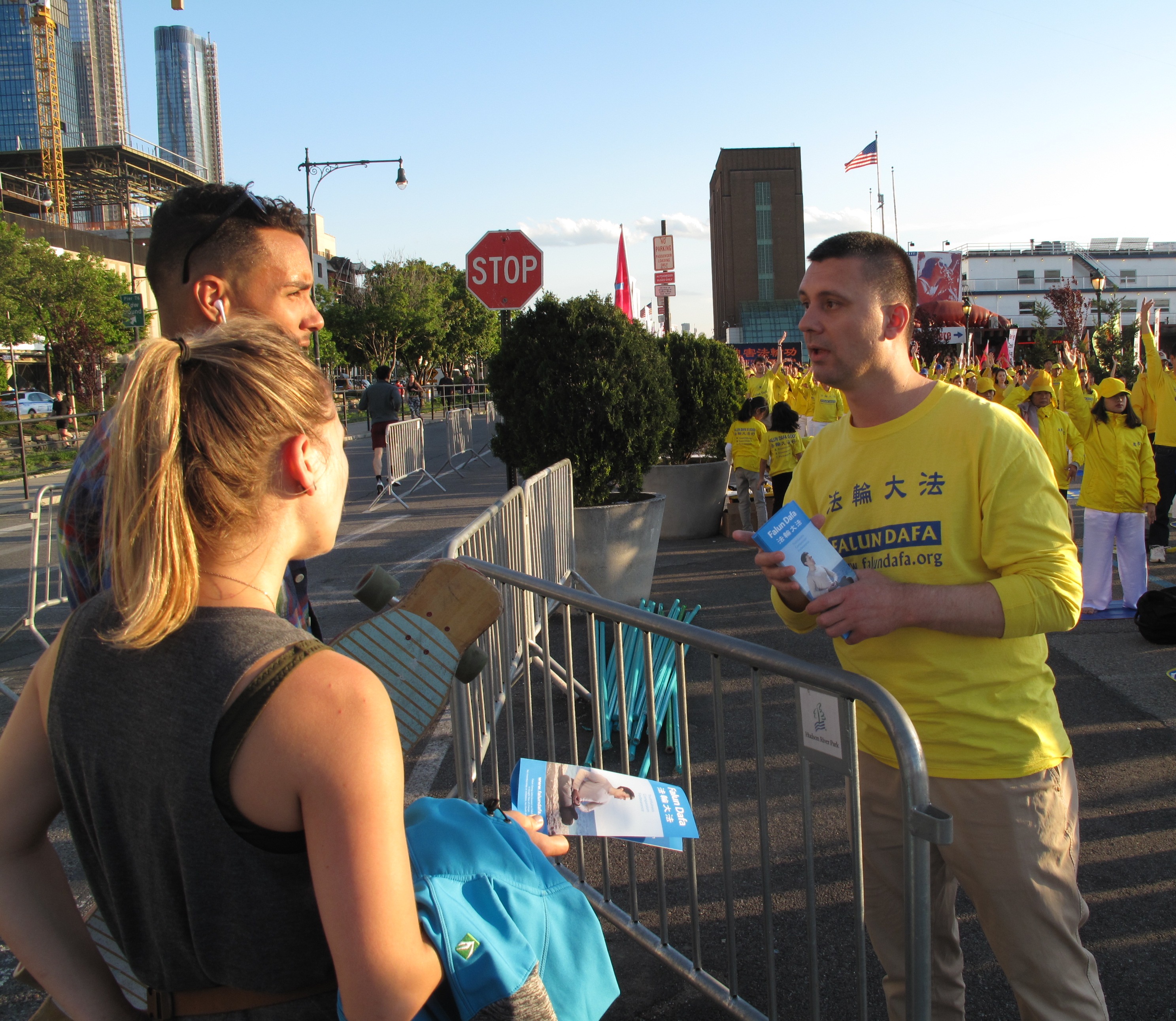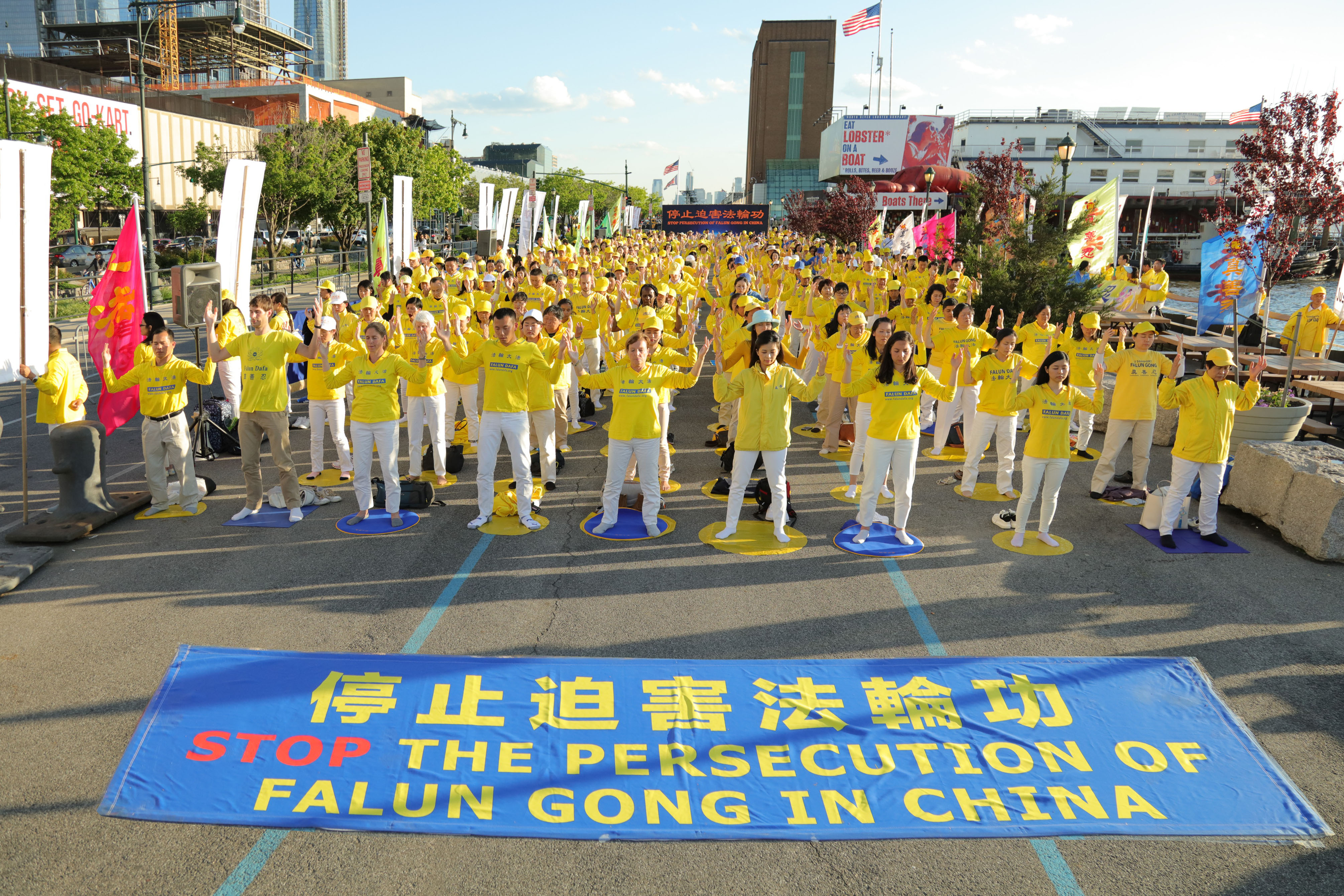 集会在下午四点半开始,法轮功学员身穿黄色T恤衫,在哈德逊河畔铺就一片金黄。学员展示“停止迫害法轮功”的立式横幅,十余个“法办江泽民”的中英文条目非常醒目。不断有外国游客问“江泽民”是谁,法轮功学员告诉他们,江泽民是出于个人嫉妒发起对法轮功迫害的罪恶元凶,中共迫害法轮功是因为它害怕法轮功的信仰“真善忍”,迫害正信的罪恶一定会受到天理报应。