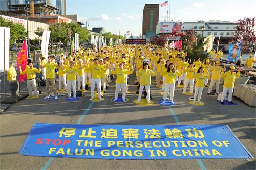 法轮功学员不间断地展示功法,发正念,祥和平静的能量场景吸引路人观看和了解真相,很多人接过法轮功真相传单认真阅读,有些国际游客是第一次听闻法轮功,明白后表示要把真相传递给周围的人。