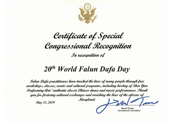 美国马里兰州联邦众议员戴维·特朗(David Trone)为第二十届世界法轮大法日颁发了国会特别褒奖。