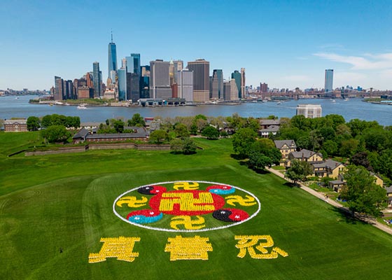 五月十八日,五千多名法轮功学员在纽约总督岛上排字,排出法轮图形和“真善忍”三个字,庆祝法轮大法洪传世界二十七周年。