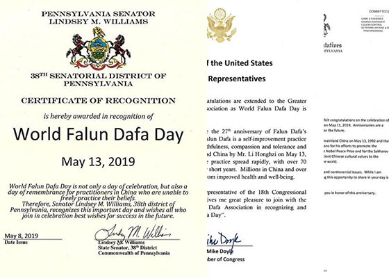 2019年5月13日,在第二十届世界法轮大法日和法轮大法弘传世界27周年之际,美国宾州国会众议员道尔、宾州州参议员威廉姆斯和州众议员多库利科先后发出褒奖信,祝贺世界法轮大法日。