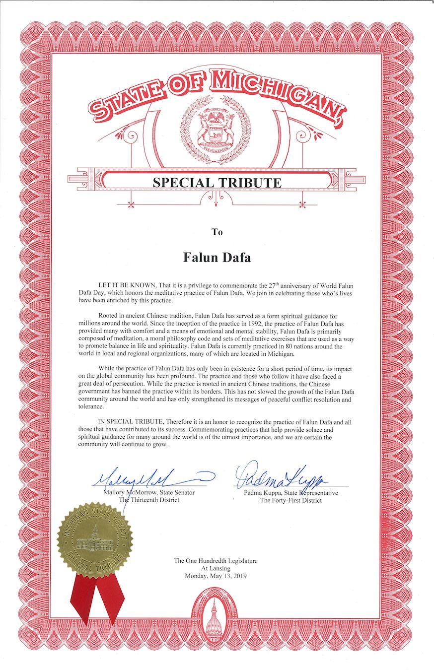 根植于中国古老的传统,法轮大法已成为全世界数百万人的精神指导。自一九九二年开始传播以来,法轮大法为人们提供了情感和心灵安宁的方法。法轮大法主要是通过打坐,注重道德规范和一整套功法组成。这是一种能够平衡生活和精神的方法。法轮大法目前在全球八十多个国家的地方和区域洪传,其中许多都位于密西根州。