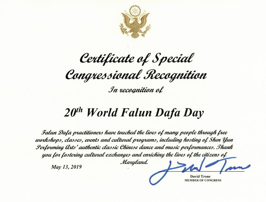 法轮大法修炼者通过免费教功,举办活动和文化演出,包括神韵艺术团的中国古典舞及音乐演出,影响了许多民众。感谢你们推动文化交流,并且充实着马里兰州居民的生活。