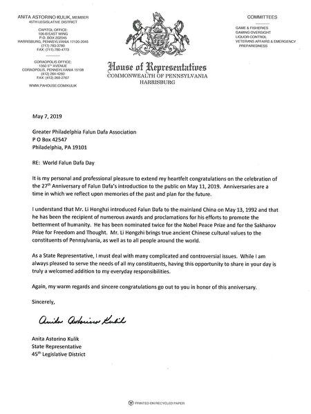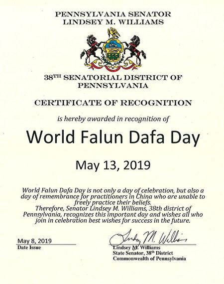 【明慧网二零一九年五月二十三日】2019年5月13日,在第二十届世界法轮大法日和法轮大法弘传世界27周年之际,美国宾州国会众议员道尔(Mike Doyle)、宾州州参议员威廉姆斯(Lindsey M. Williams)和州众议员多库利科(Anita Astorino Kulik)先后发出褒奖信,祝贺世界法轮大法日。