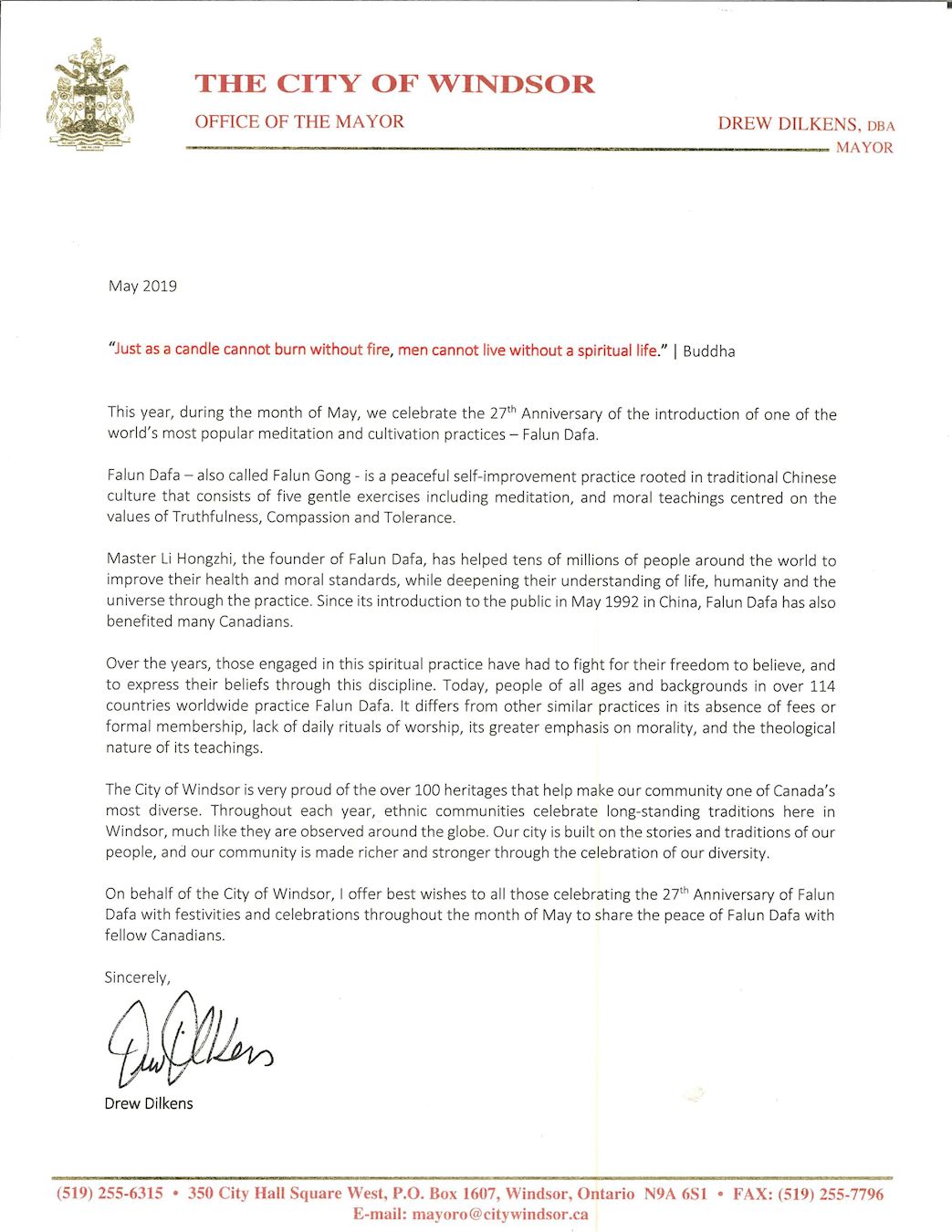 【明慧网二零一九年五月三日】二零一九年五月,在法轮大法弘传二十七周年来临之际,加拿大温莎市市长专门颁发了贺信及奖状,宣布二零一九年五月为温莎市法轮大法月。在贺信中,市长德鲁·迪尔肯斯(Drew Dilkens)代表温莎市,向庆祝法轮大法二十七周年的所有人致以最良好的祝愿。