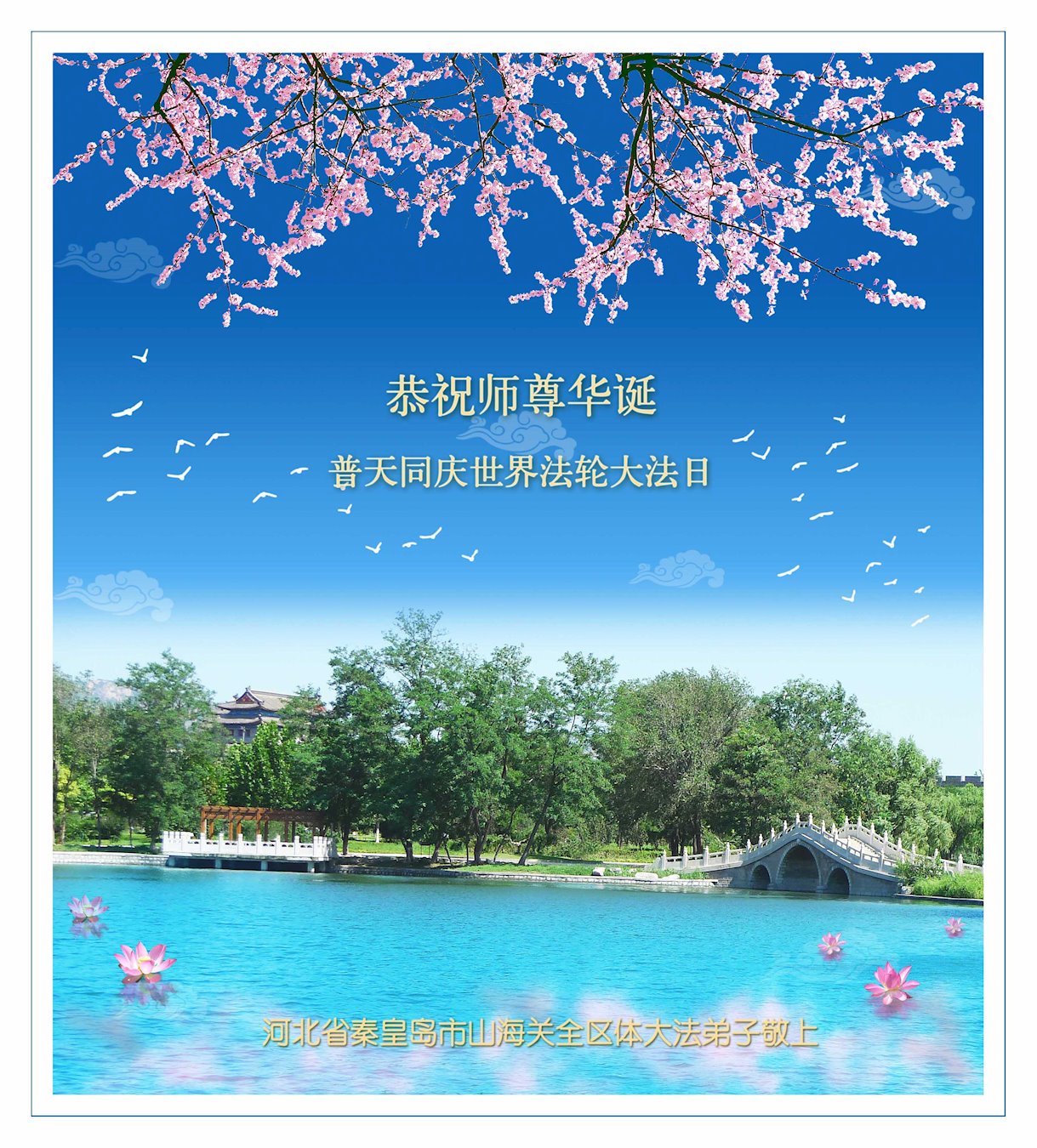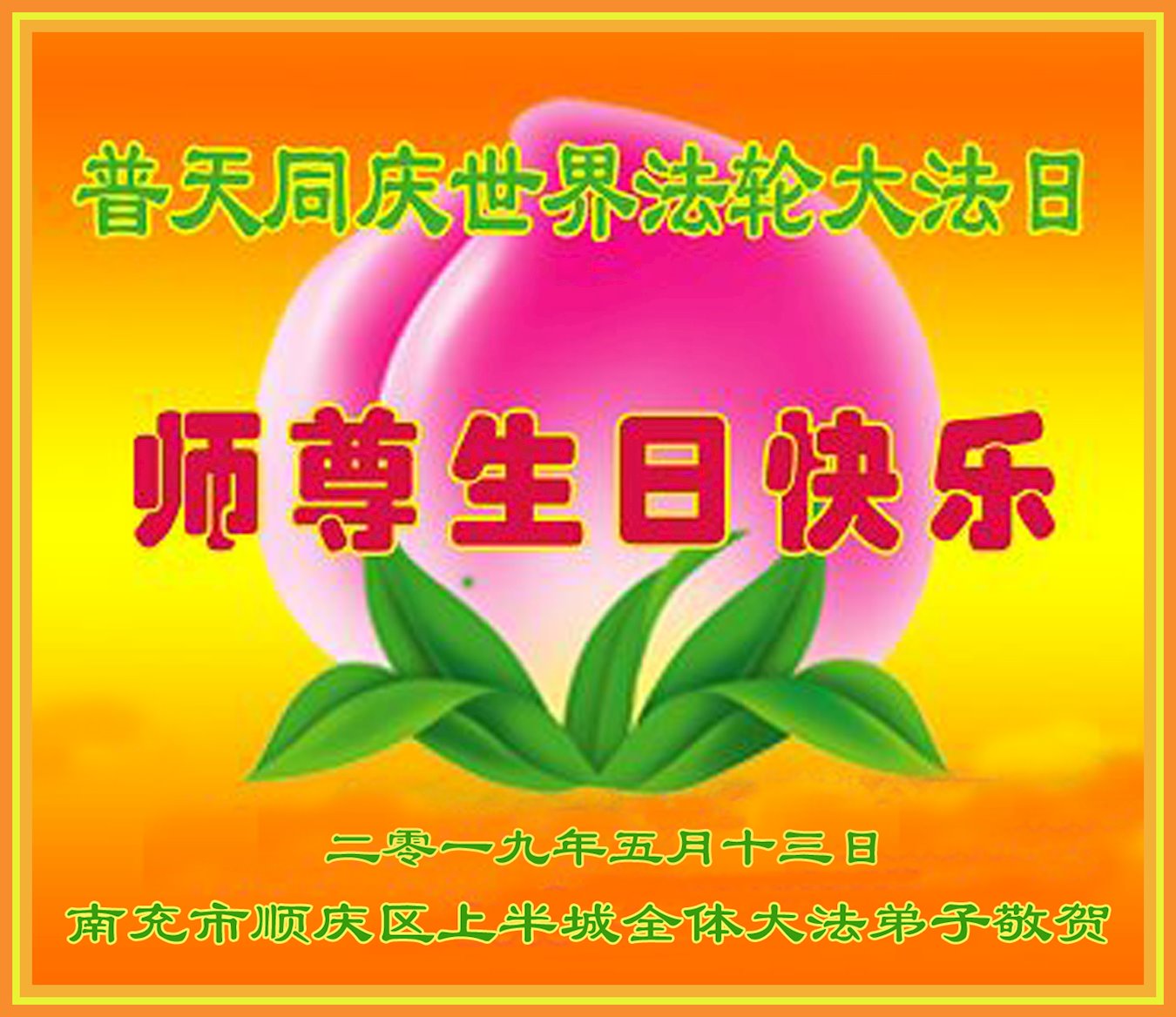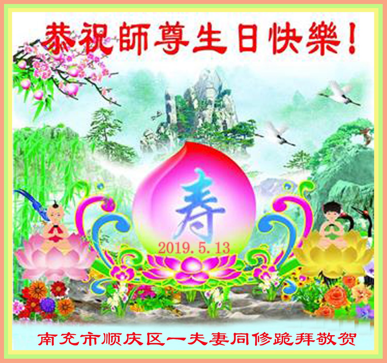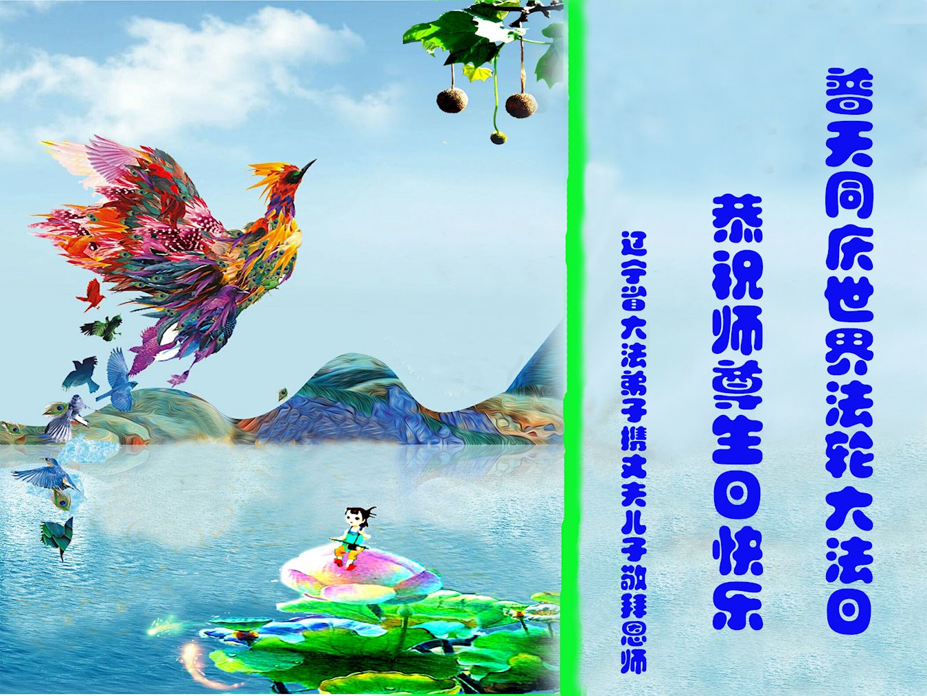 普天同庆“世界法轮大法日”,“法轮大法好”、“真善忍好” 九字吉言传洪宇。恭祝师尊生日快乐!谢师恩!弟子再精進。