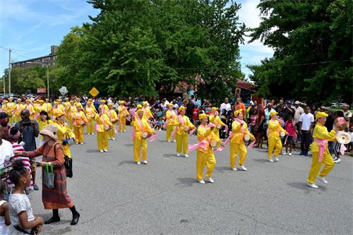 由三十多名法轮功学员组成的腰鼓队是该游行队伍中唯一的亚裔团体,特别引人注目。她们身穿中国风韵的亮黄色服装,面带发自内心的喜悦,迈着轻盈整齐的步伐,敲出雄壮嘹亮的鼓声,获得沿途民众的热烈掌声,许多人争相拍照录像。