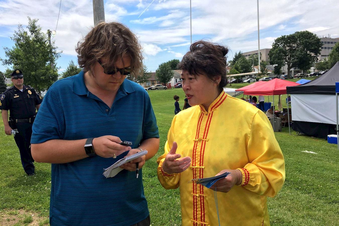 ![]() 图8:当地最大报之一《德拉华郡每日时报》的记者在采访法轮功学员。 |