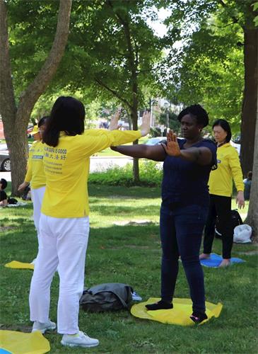 因为学功的人很多,所以一天下来她基本都是在教功,一波学完一波又来,她说:“觉得这场很好,大家一炼功很多人就愿意来,有很多有缘人,发出去很多资料,都发完了,效果很好。人山人海,这种感觉很好。有时间都要多来,不来挺可惜的,因为夏天人很多啊。”