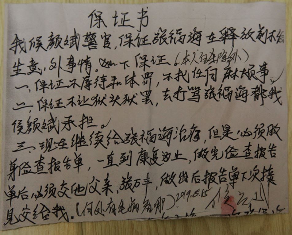 十五日早张父给侯彦斌打电话,要求见儿子。见到侯时张父说:你们这里的药放没放毒我也不知道,我给儿子买了二百多元的药,侯将药放到自己车里。这时张父将自己代侯写的不再虐待张福海的保证书交给侯彦斌,侯将后两条撕掉,添加“本人自杀除外”后,在保证书上签字按手印。