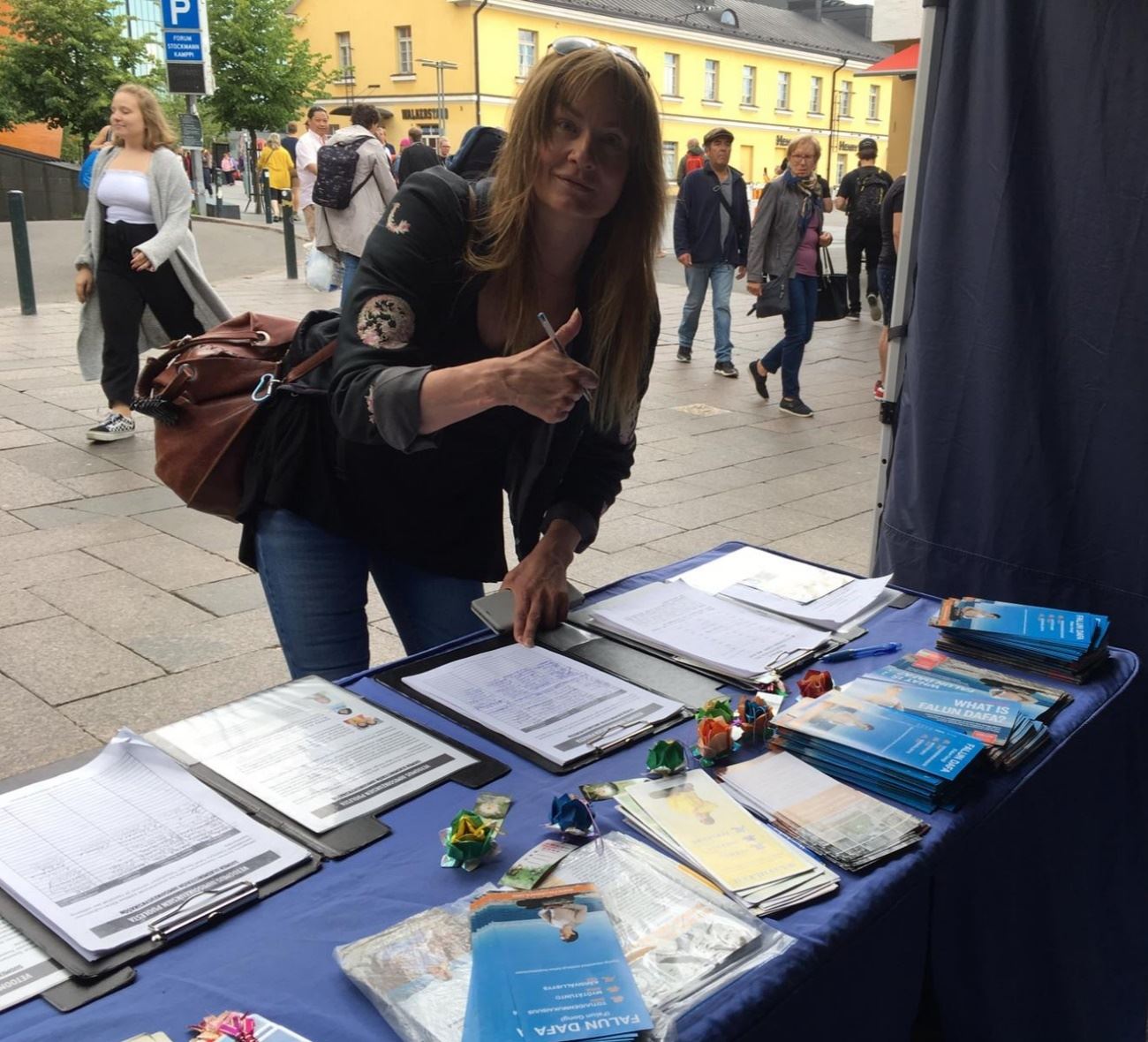 芬兰女士丹妮达·林德罗斯(Danita Lindroas)径直来到反活摘器官征签表前,郑重地写下自己的名字。几年前,当她第一次听说中共活摘法轮功学员器官的消息时,震惊不已,无法相信竟然有这么邪恶的事情发生在这个地球上。她再三感谢法轮功学员坚持不懈将邪恶曝光于全世界的努力。离开前,丹妮达表示自己今后将利用脸书(facebook)广泛传播法轮功无辜遭迫害的事实,为早日停止迫害尽自己的力量。