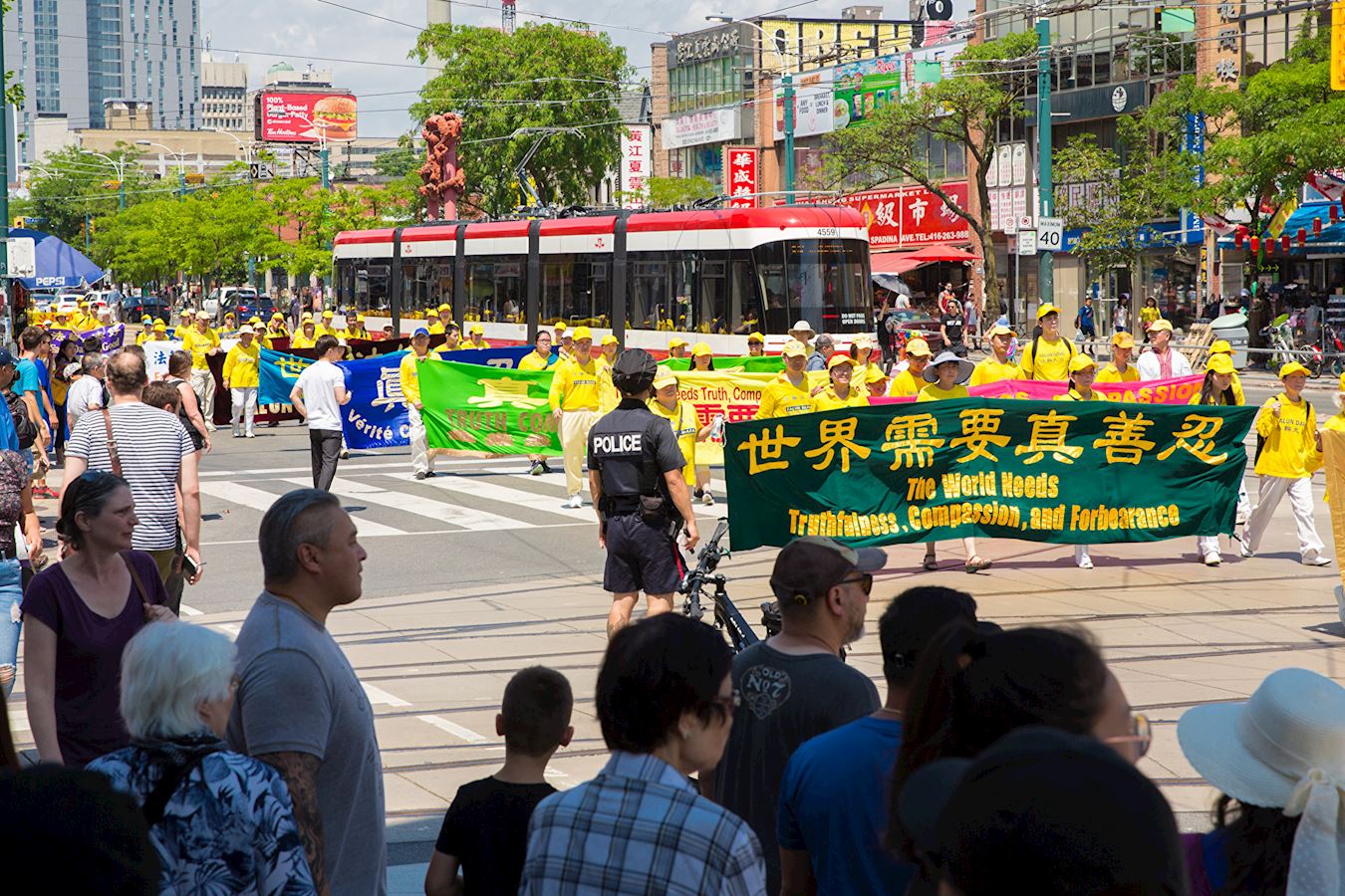 下午一点半大游行开始时,气温上升到三十三摄氏度(加上湿气,实际温度超过四十摄氏度)。法轮功学员浩大的游行队伍,宛如酷热天气下的清流,浩浩荡荡穿过多伦多市中心,经唐人街,最后转回到市政厅广场,全程历时近二小时,得到沿途民众的支持和欢迎。