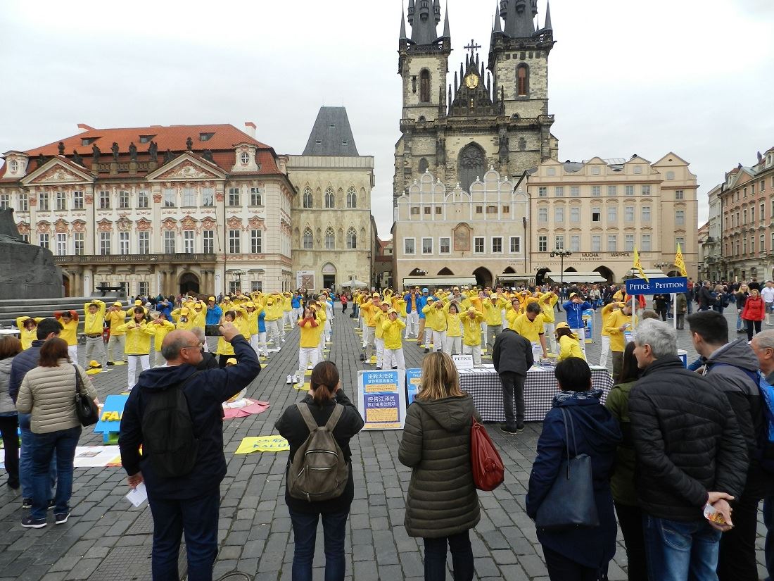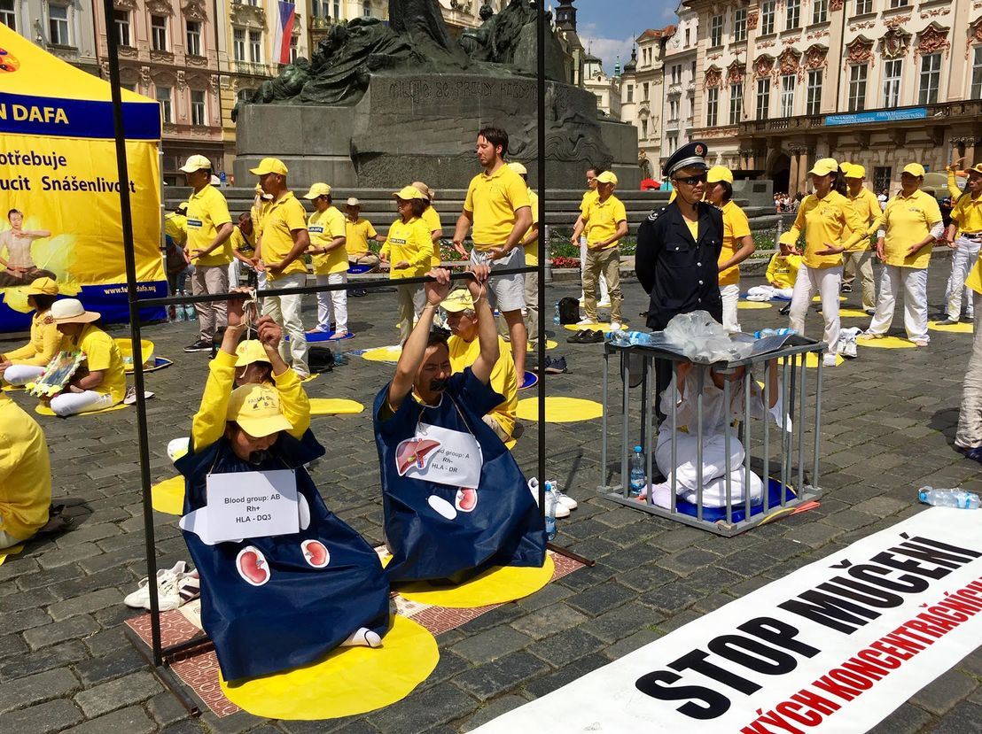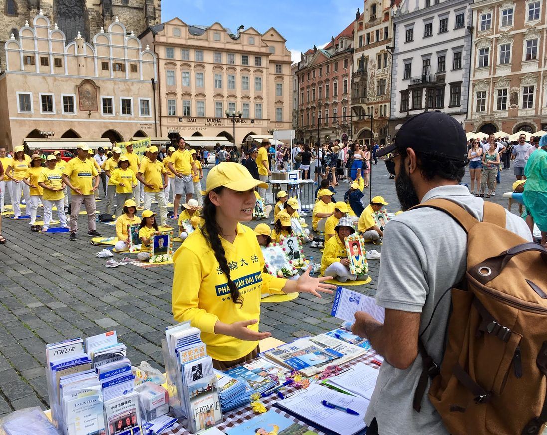 布拉格的抗议活动于七月二十日继续进行。二十日上午,在中共大使馆前集会并烛光悼念被中共迫害致死的法轮功学员,呼吁法办迫害元凶江泽民。模拟活摘器官及酷刑,抗议和谴责二十年来中共对法轮功学员的血腥镇压与残酷迫害。宣读了致大使张建敏先生的公开信,向他讲真相,并呼吁他认清当前形势,能正确对待法轮功问题,不要参与迫害法轮功。二十日下午,法轮功学员在老城广场举行各种活动:向游人演示五套功法,模拟活摘器官,酷刑演示,派发各种文字的真相资料,向中国大陆游客讲真相劝“三退”等活动。