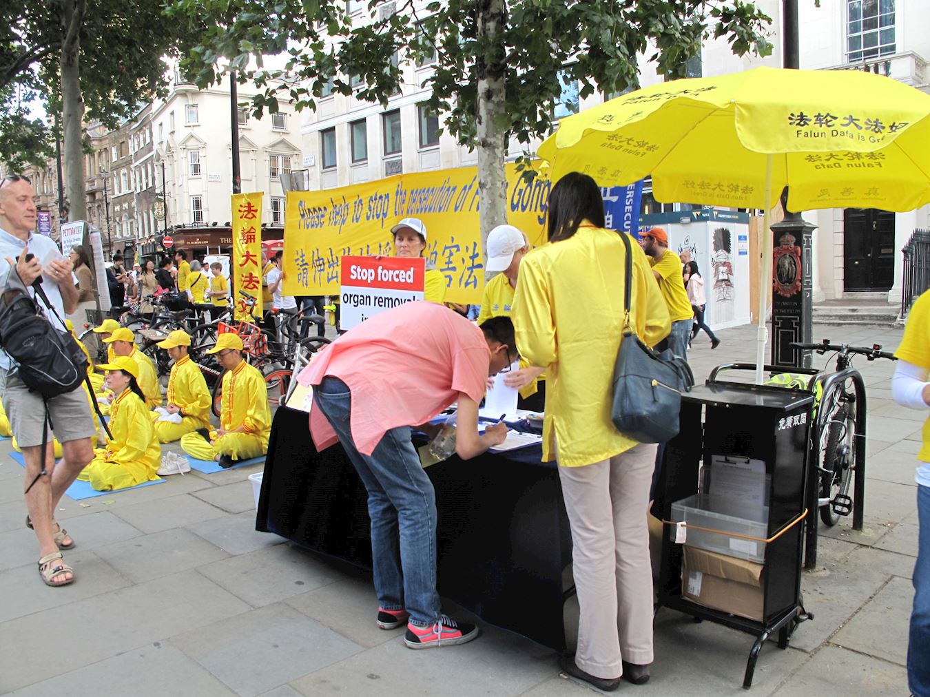 麦克尔当天从英国普里斯顿(Preston)来伦敦参加抗议活动,大约十年前他在伦敦遇到过法轮功,他当时就签名支持法轮功学员反迫害。