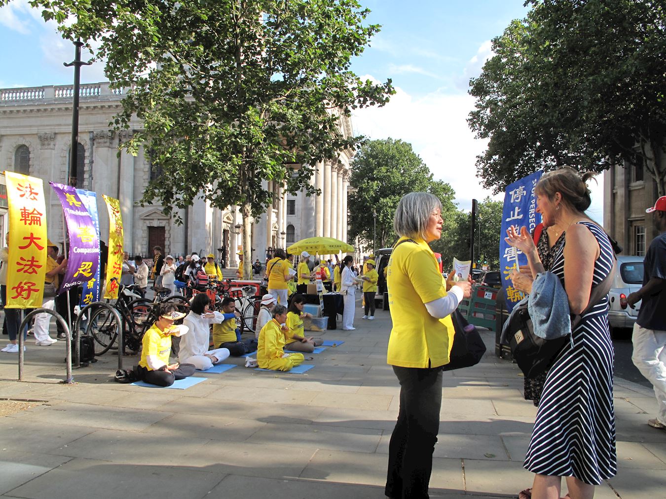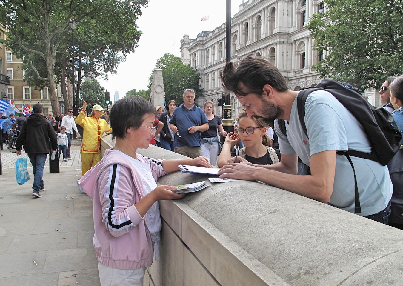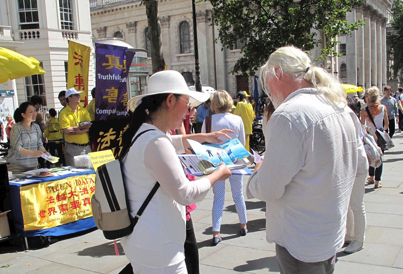 ![]() 图7:二零一九年七月二十日,在伦敦圣马丁广场,这女士(右)被法轮功功法演示所吸引,询问学员真相,并在反迫害征签表上签了名。 |
