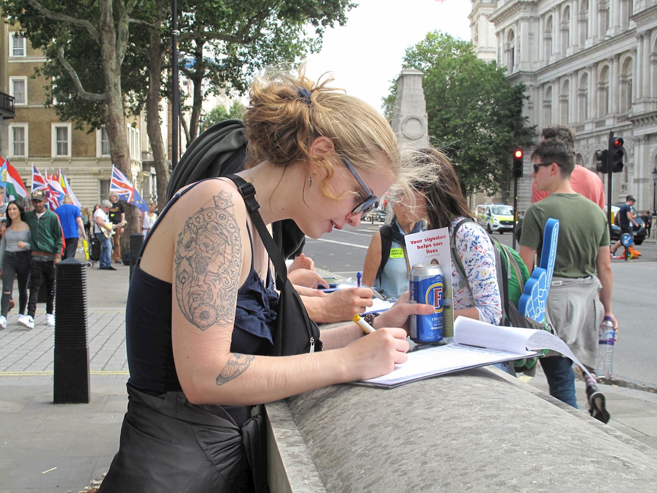 ![]() 图5:二零一九年七月二十日,在伦敦圣马丁广场,一位在英国留学的香港青年听法轮功学员讲真相,在法轮功反迫害征签表上签名。 |