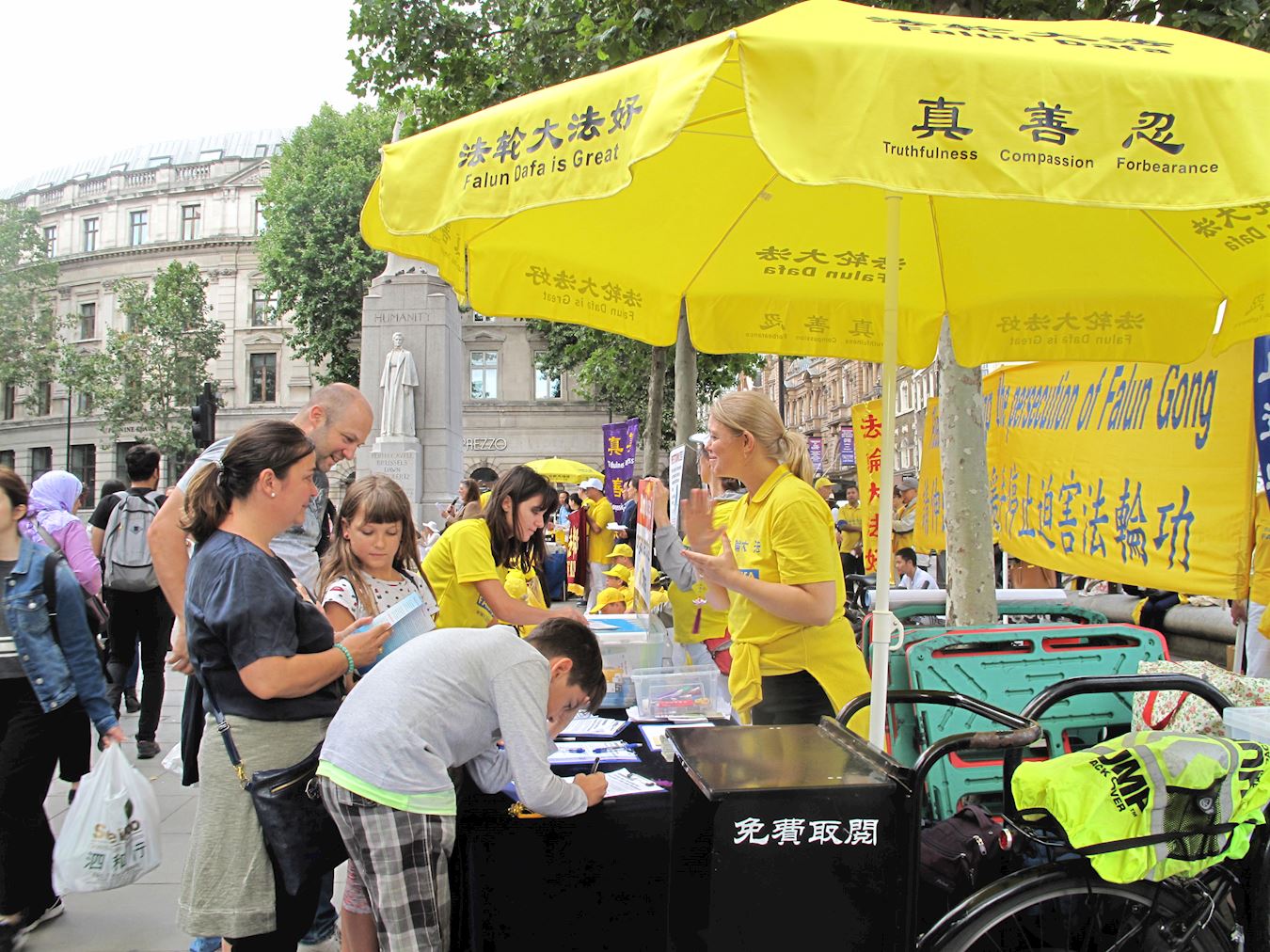 ![]() 图13:二零一九年七月二十日,在伦敦圣马丁广场,从匈牙利布达佩斯来伦敦旅游的律师拉维亚(Lavia)一家四口签名支持法轮功反迫害 |