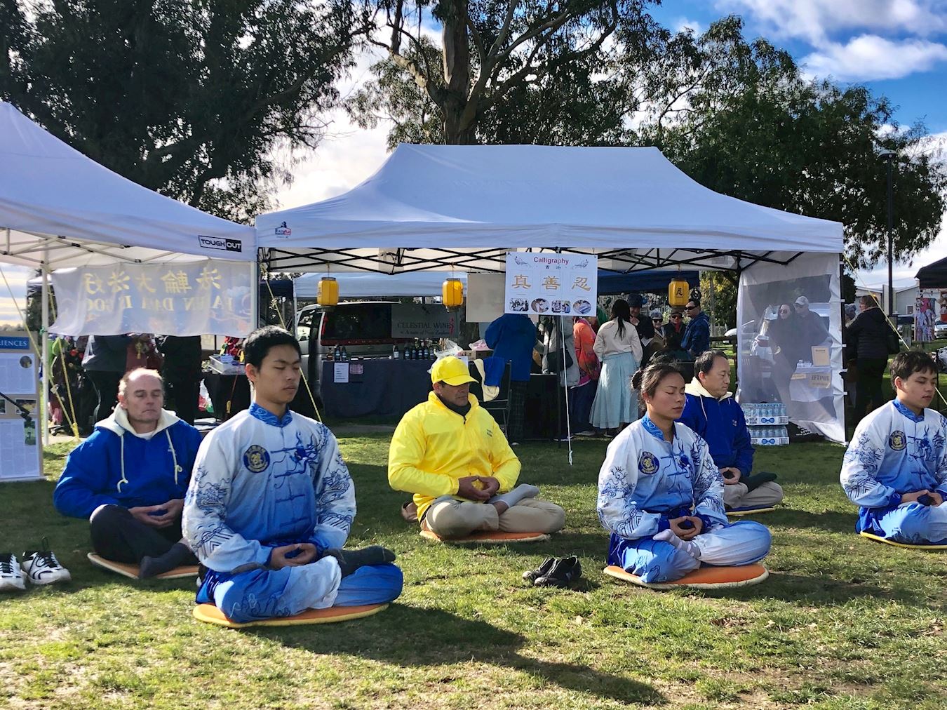 法轮功学员舒缓祥和的功法展示、古筝演奏、舞龙表演,还有中国书法介绍都吸引了不少观众驻足欣赏,流连忘返。还有不少当地居民过来展位,询问附近能够学习法轮功的地方。很多人们都表示认同宇宙特性“真、善、忍”,相信这会给世界带来美好。