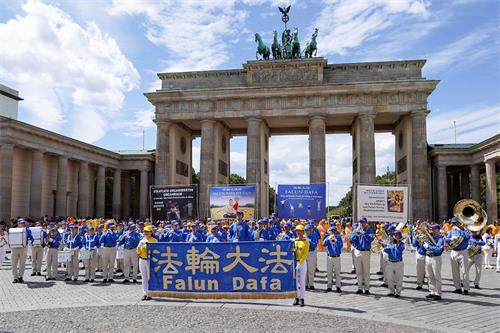 '图1~4:法轮功学员在柏林的巴黎广场上集会,介绍法轮功,并揭露中共对法轮功学员的迫害'