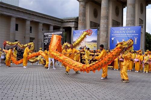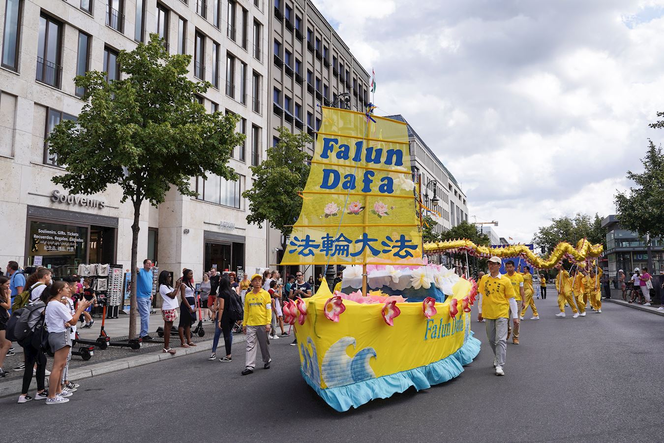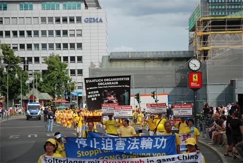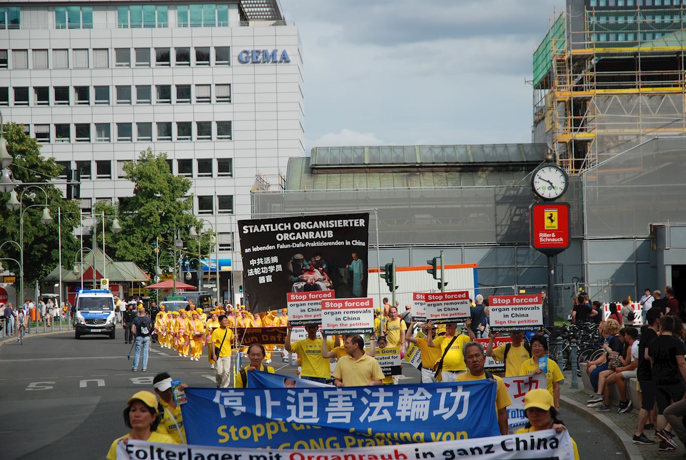 【明慧网二零一九年八月十二日】(明慧德国记者站报道)二零一九年八月十日,来自德国各地的法轮功学员汇集到柏林市中心的御林广场(Gendarmenmarkt),开始一整天的游行、集会和烛光守夜活动。第一场游行从上午十一点开始,途经弗里德里希(Friedrichstrasse),贝人大街 (Behrenstrasse),菩提树下大街(Unter den Linden),到布兰登堡门前的巴黎广场。广场前法轮功学员代表揭露中共对法轮功长达二十年的迫害,宣读德国国会议员对本次活动的支持信。广场前游客如织,纷纷驻足聆听学员代表的演讲,在反对活摘器官和抵制迫害的征签簿上签名。