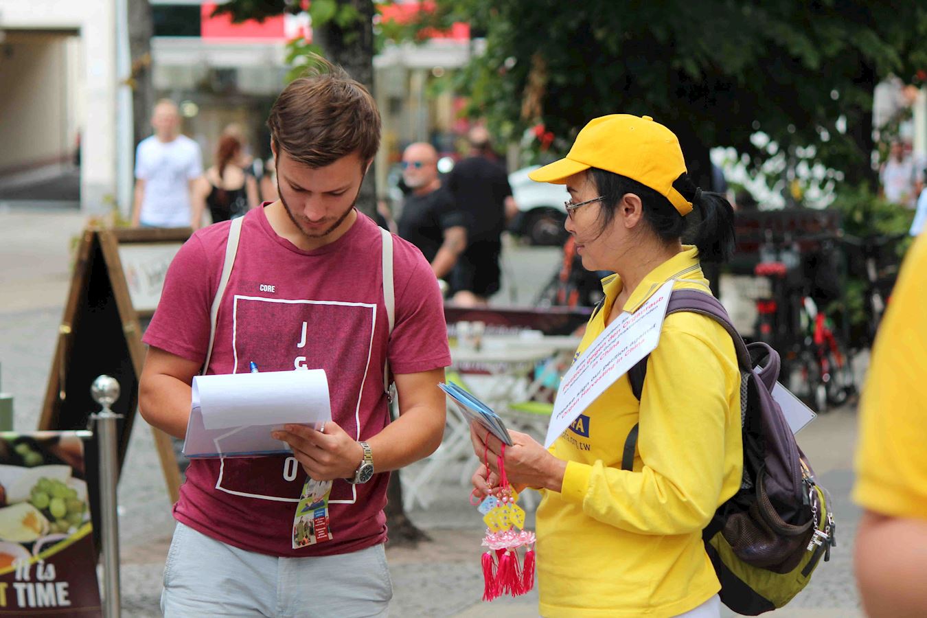 卡特琳娜说:“游行是一个非常好的形式吸引人们的关注。人们会听到音乐,看到讯息,会来看到底发生了什么事情。传单上的信息给出很多资讯,然后能跟法轮功学员交谈,(对法轮功)有很正面的印象,法轮功是对人们有益的。”