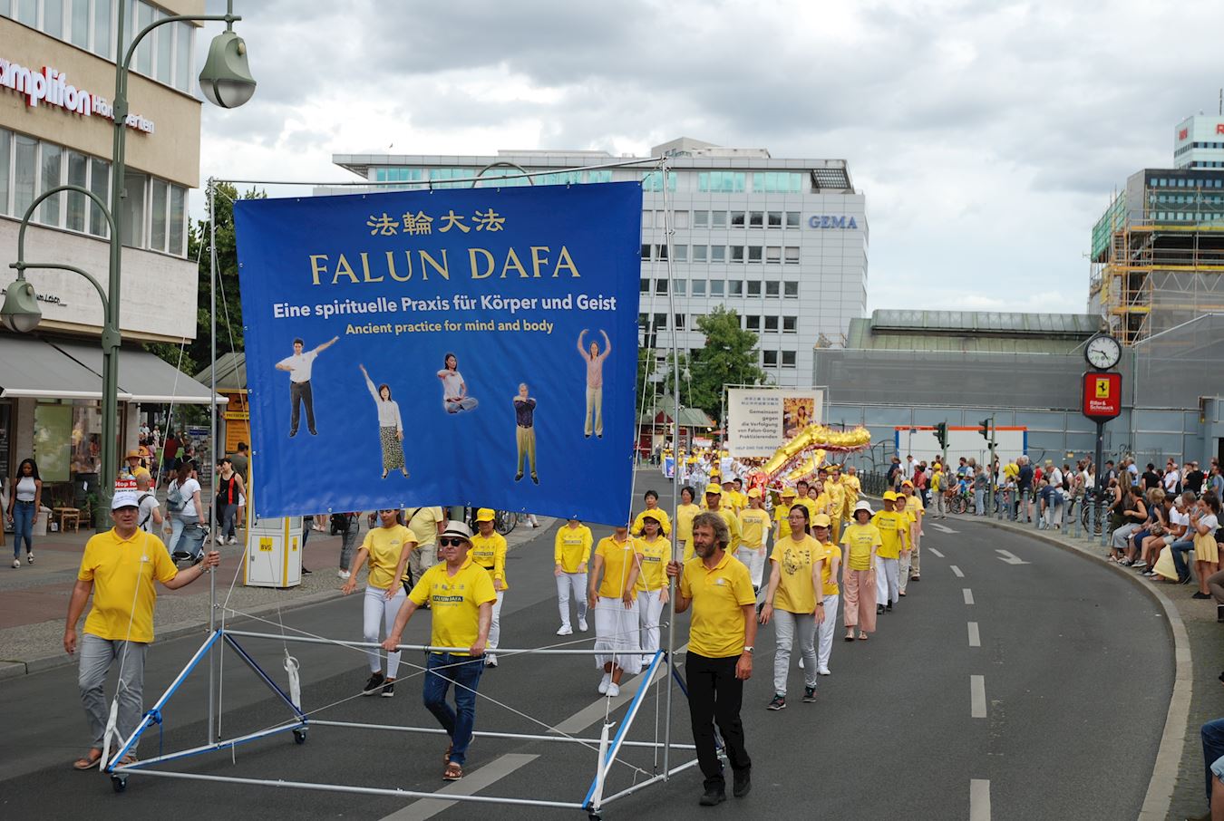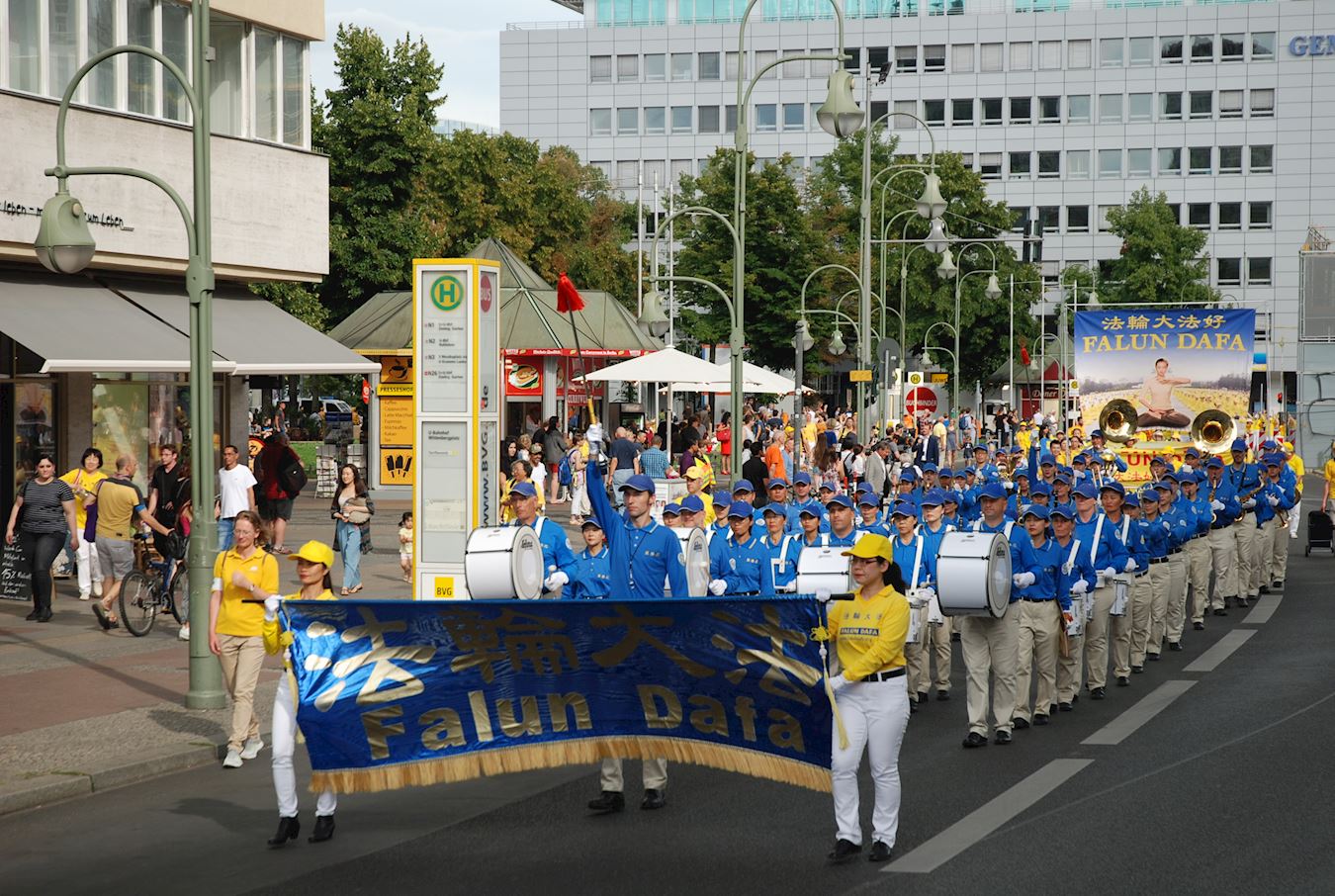 下午两点钟,第二场游行从波兹坦广场(Potsdamer Platz)开始,维滕别格广场(Wittenbergplatz)结束。晚上八点,法轮功学员回到巴黎广场,点上蜡烛,在平和肃穆中悼念被中共迫害致死的大陆法轮功学员,黑夜中人们被温暖的烛光吸引,许多人走上前来默默注视,直到活动结束才带着资料离开。
