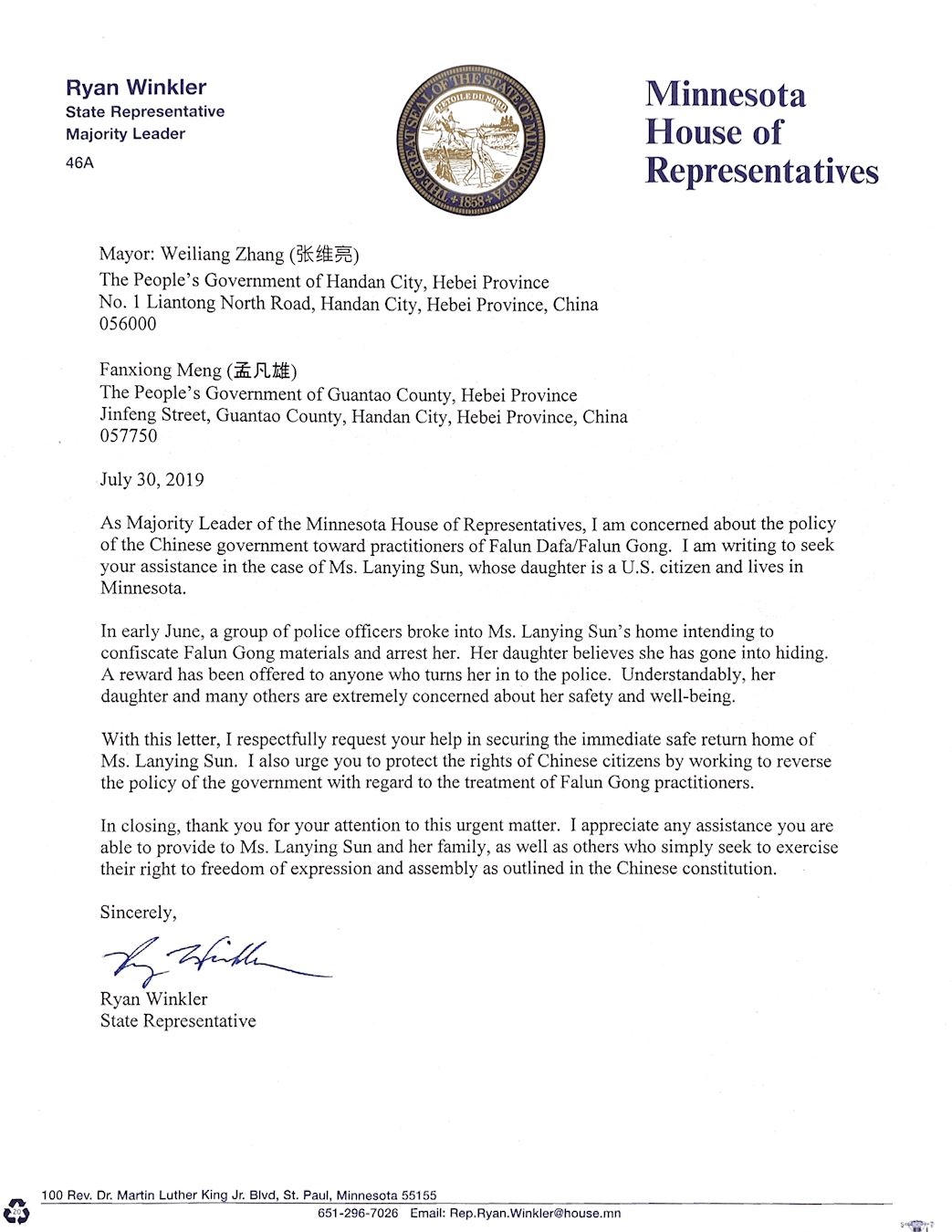 ![]() 图2:明尼苏达州众议院多数党领袖瑞恩·温克勒(Ryan Winkler)致给河北省邯郸市政府的信件 |