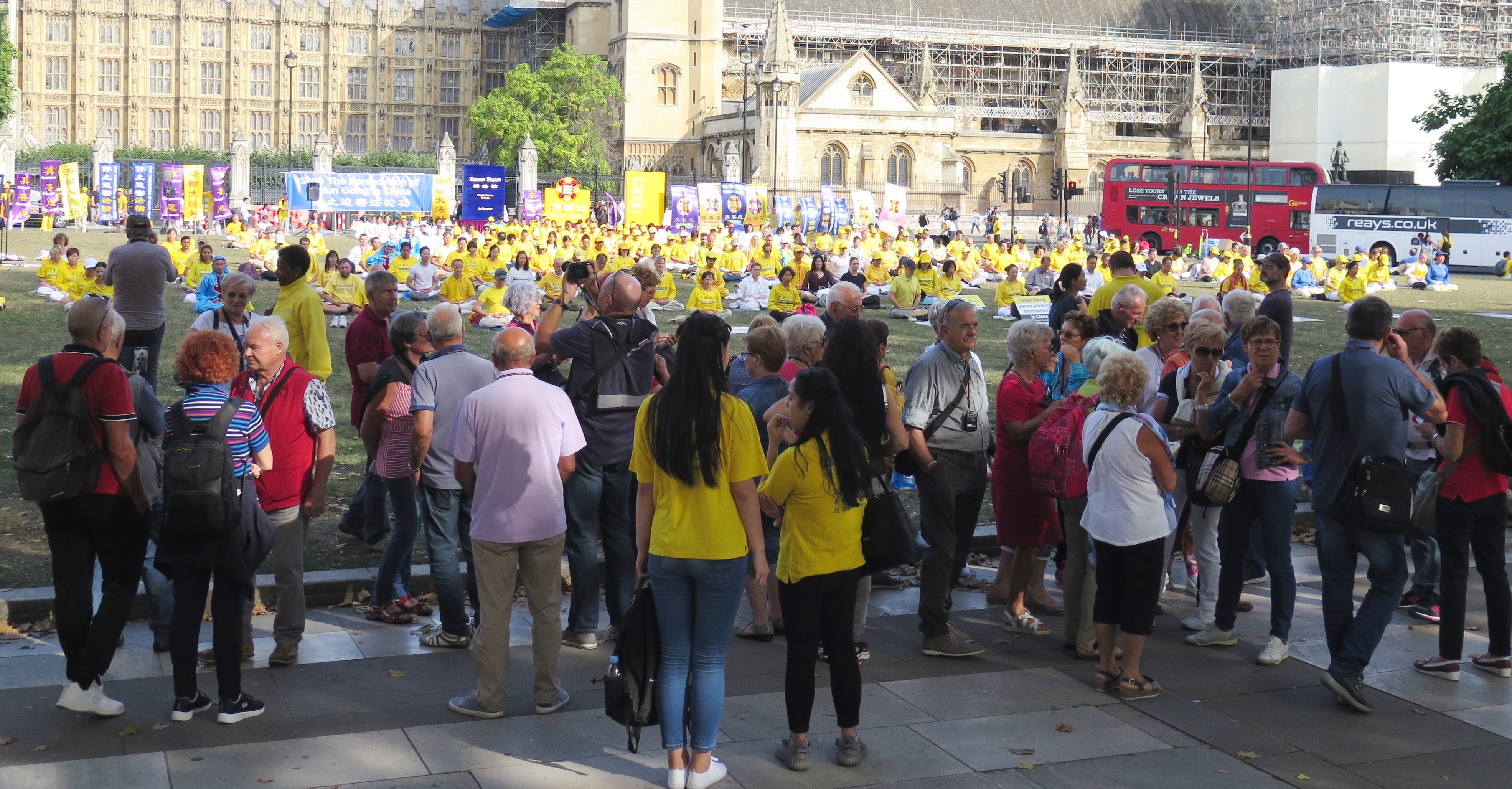 在学员们集体炼功的场地两侧还设立了征签桌,供民众签署的征签表呼吁英国政府采取法律步骤,禁止英国人前往中国进行器官移植旅游,并且要求中共停止对法轮功的迫害。