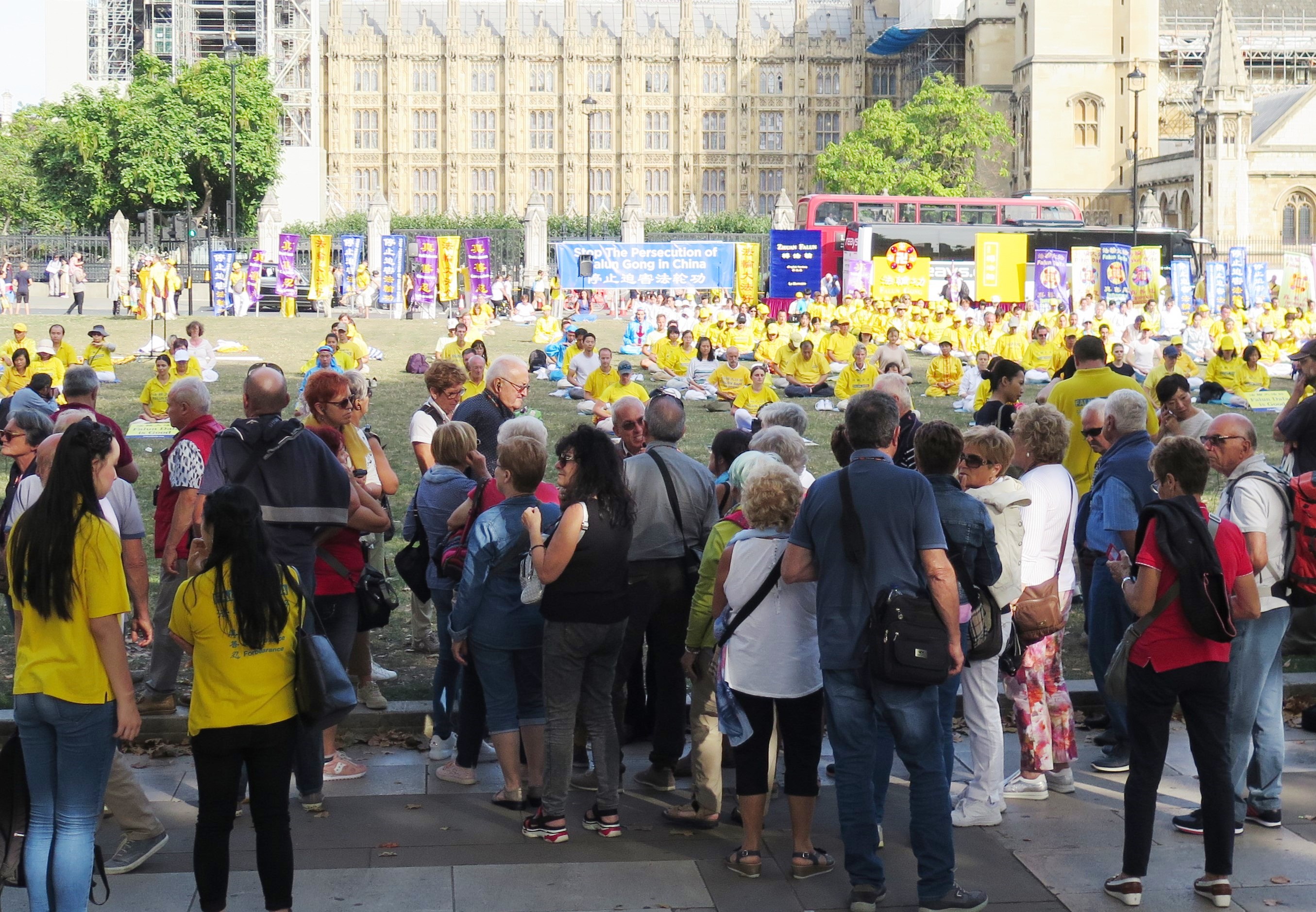 在游客如织的特拉法加广场(鸽子广场)、唐宁街首相府对面、大英博物馆前,以及莱斯特广场,人们为法轮功功法的祥和能量、法轮功学员的平和善良所触动,被中共迫害法轮功学员的罪恶震惊。人们驻足观看法轮功学员们炼功,认真阅读展板和传单上的信息,或与学员交谈,在征签表上签名反迫害。一张张签满名字的征签表是人们对法轮功学员的声援,也是一颗颗善良的心正汇聚而成的、日益巨大的正义与良知的力量。