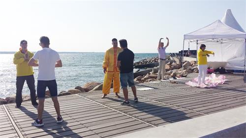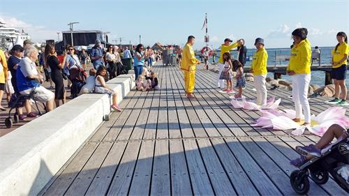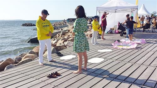 活动期间,不断有游客驻足观看,有的拍照,有的念横幅上的Falun Dafa is Good(法轮大法好),有的干脆在附近坐下,边休息边看,有的询问在哪里可以学炼功法,有的远远的自己跟着法轮功学员的动作炼。活动第二天,城市活动这一项目的负责人路过法轮大法学员的摊位,说非常高兴每年有法轮功学员的参与并感谢学员们把一切都安排的这么好。