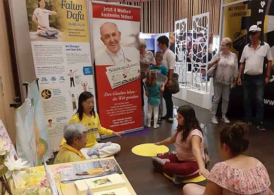 七月以来,德国巴伐利亚州的法轮功学员陆续参加了儿童节和健康博览会,大量民众被法轮功的祥和吸引,源源不断地有人来学功,体验法轮功功法的美好。
