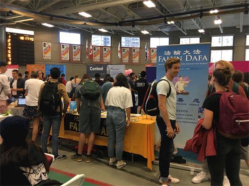 负责法轮大法在麦大俱乐部展位的几位青年大法学员们体现出来的平和、理性和得体的举止,与中共对法轮功和法轮大法修炼人的抹黑,形成了鲜明的对比。和过去不同,今年越多的华人留学生主动走向法轮大法展位,主动向修炼法轮大法的青年学子提出诸多的问题。当他们的疑惑得到澄清,他们收获的是满满的欣喜。有的留学生主动拿取《九评共产党》阅读,有的表示要尽快恭读《转法轮》