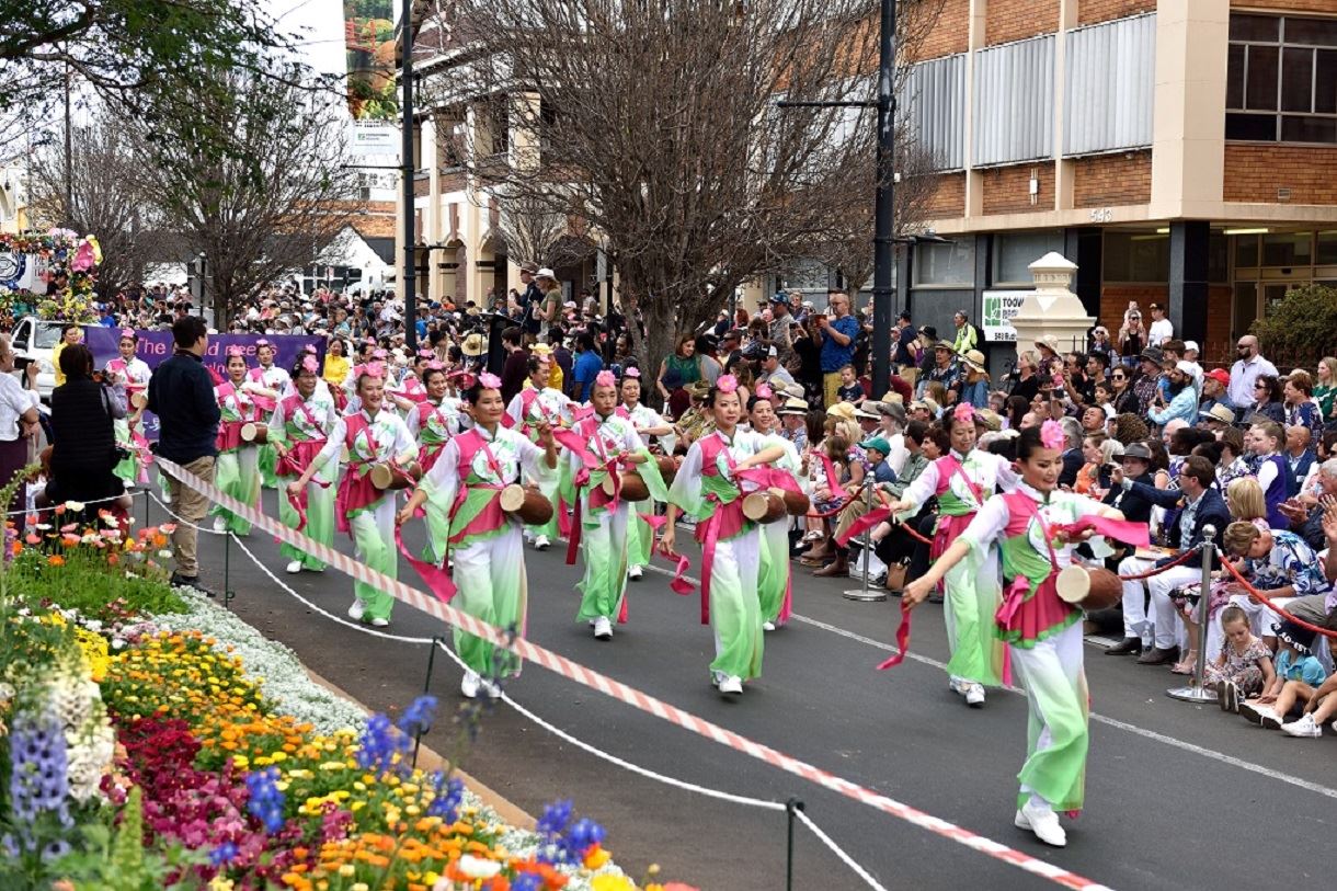 今年花卉游行的主题是“花的力量”,法轮功团体的游行队伍由三部份组成,分别是“舞龙队”,“莲花仙子队”,“腰鼓队”。主办方在游行沿途设置多处高音喇叭和主持人讲解,当一位主持人看到一朵手工制作的粉色大莲花花轿,四周围绕着身着古典仙女服的法轮功学员时,发自内心的赞叹:“好漂亮的花啊!真是太喜欢了!”紧接着另一位主持人给在场所有观众介绍:“法轮功从一九九九年开始每年都加入我们的花车大游行,法轮功是以真善忍为指导原则的一种传统修炼功法,有五套动作作为其辅助修炼,全世界有超过一亿的人因为修炼法轮功身心受益。”