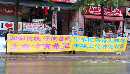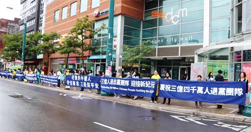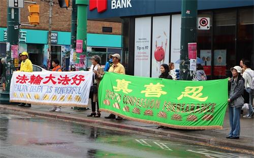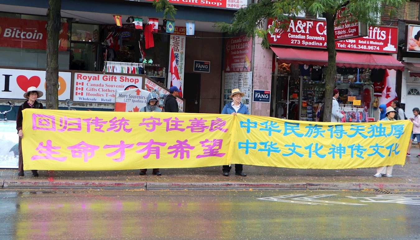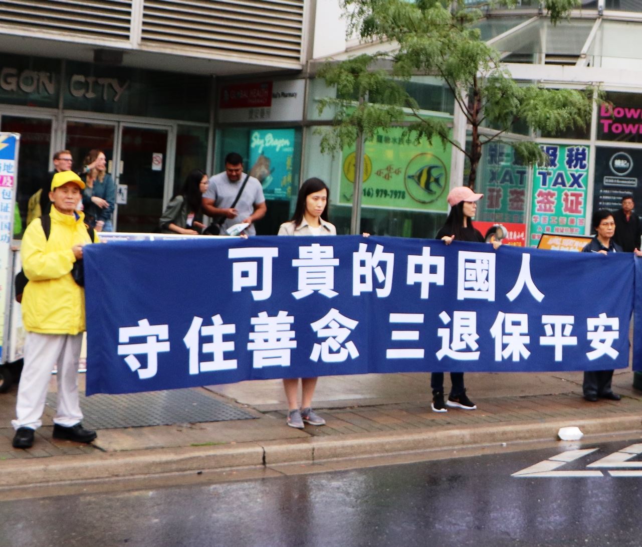 【明慧网二零一九年九月三十日】(明慧记者章韵多伦多报道)二零一九年九月二十八日下午,加拿大多伦多部份法轮功学员为声援三亿四千万中国勇士退出中共邪党组织,在中区唐人街拉起真相横幅筑起“勇气长城”,学员们给路人发放真相资料向中西方游人讲述法轮大法的美好,以及中共迫害法轮功二十年的真相,明白真相的民众都表示中共很快就垮台。开始天气一直下雨,学员们在雨中坚持着,有经过的汽车给他们响喇叭表示支持的,有司机竖拇指表示赞赏的。后来雨停了,天也晴朗了。
