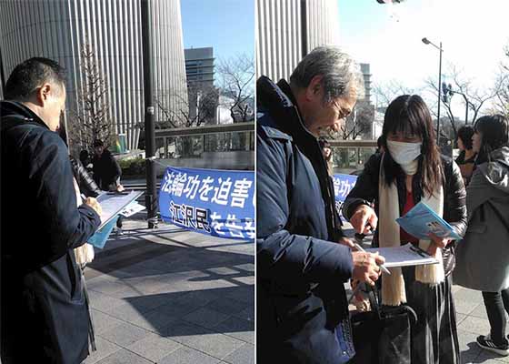 日本民众新年有去神社参加新年参拜的风俗,借此时机,日本法轮功学员们每年新年期间,都去神社前向成千上万的日本民众讲真相。